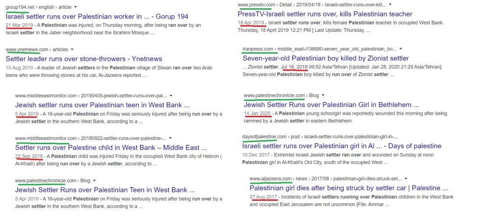 It wasn’t until today that I realized a tweet didn’t permit enough words for me to explain the significance of the collage. I deleted my tweet. I thought perhaps someone would take the reports at face value, and believe that settlers deliberately run over Palestinian children on at least a quarterly basis.