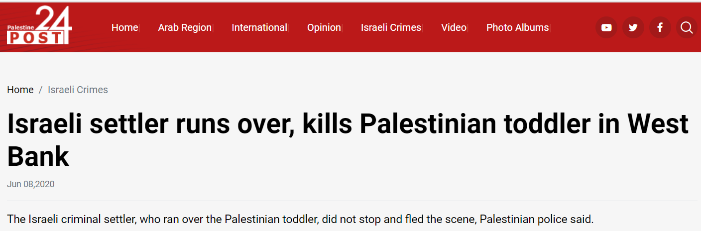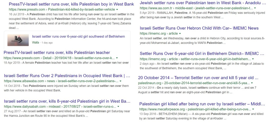I’m aware that publications hostile to Israel have, for at least ten years, been publishing stories with the headline ‘Settler runs over Palestinian child.’ There are some variations. They may say ‘Jewish settler’ and occasionally the victim will be a woman but, several times a year, the headline will specify a child, boy or girl, age 5 or 8 or sometimes a teenager. Usually, the running over is described as deliberate and the consequence as fatal.