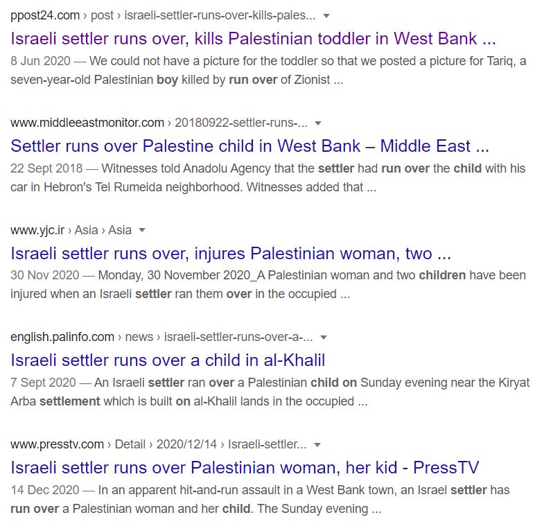 I googled on ‘Settler runs over Palestinian child,’ and copious items appeared, all originating from Middle Eastern sources and getting plentiful exposure on English-language forums. I selected one report for each year and made a collage of screen shots, shown below, which is how I usually display antisemitism on Corbynist forums. I then tweeted the image.