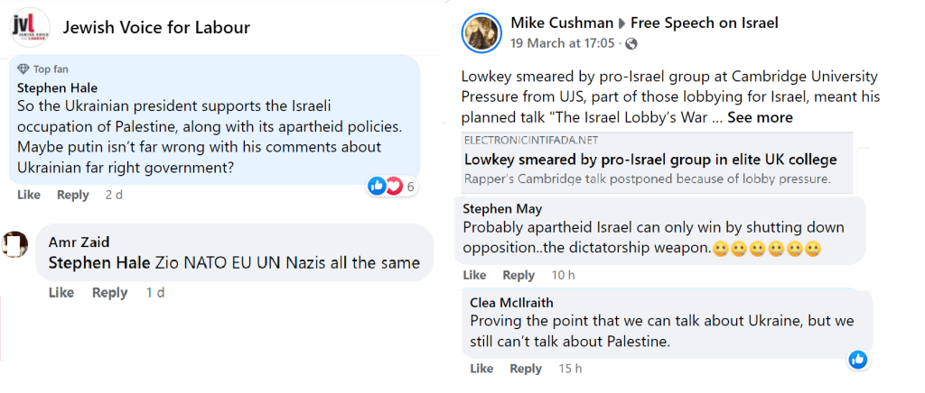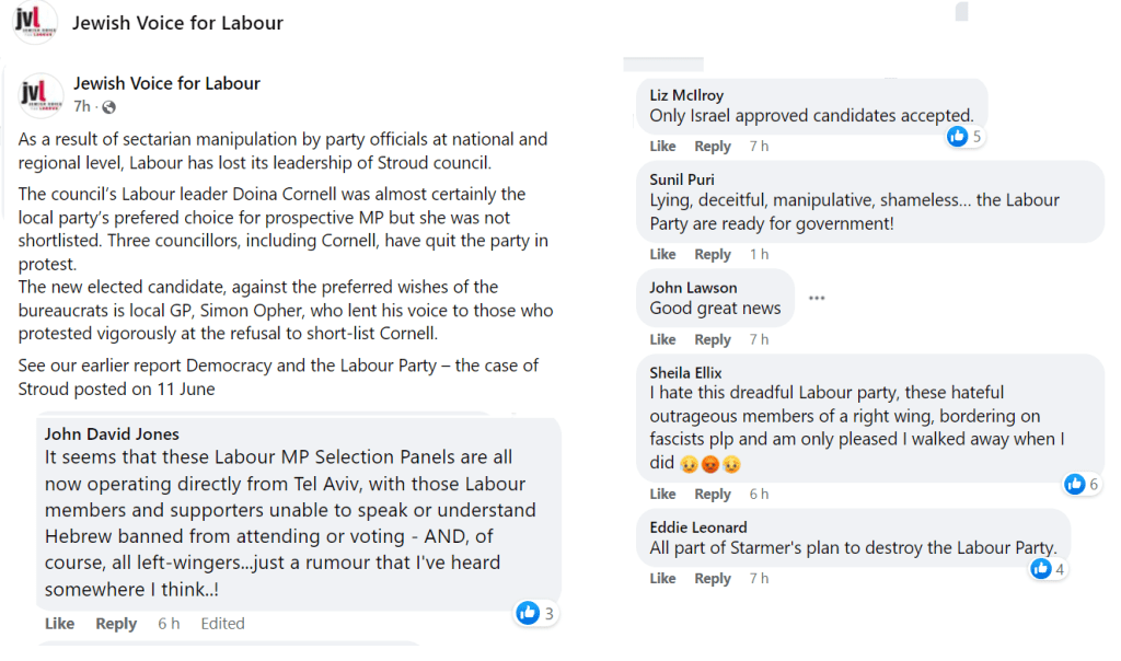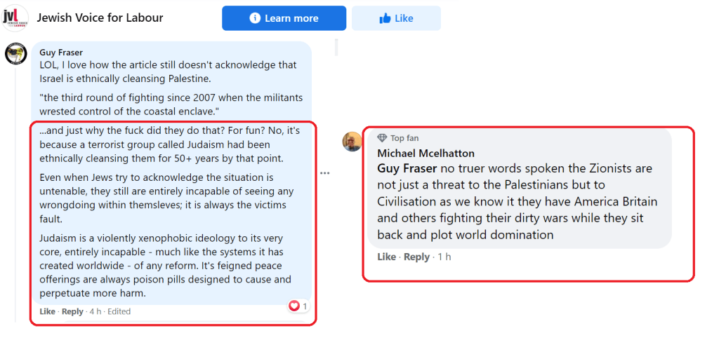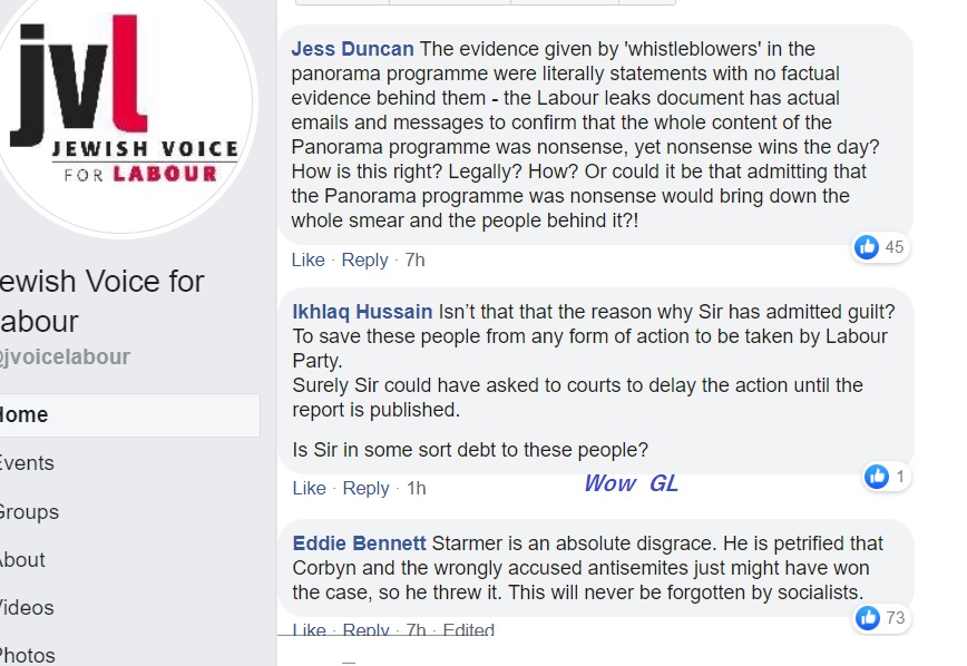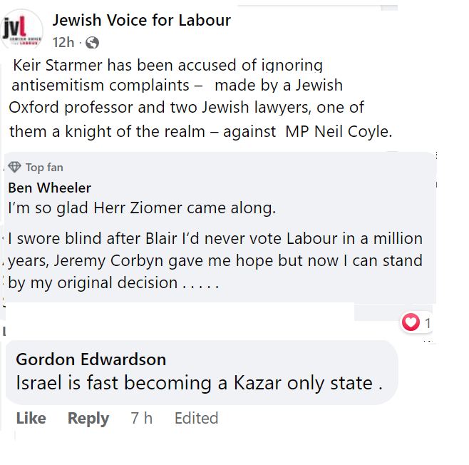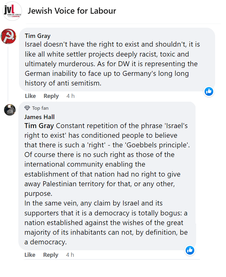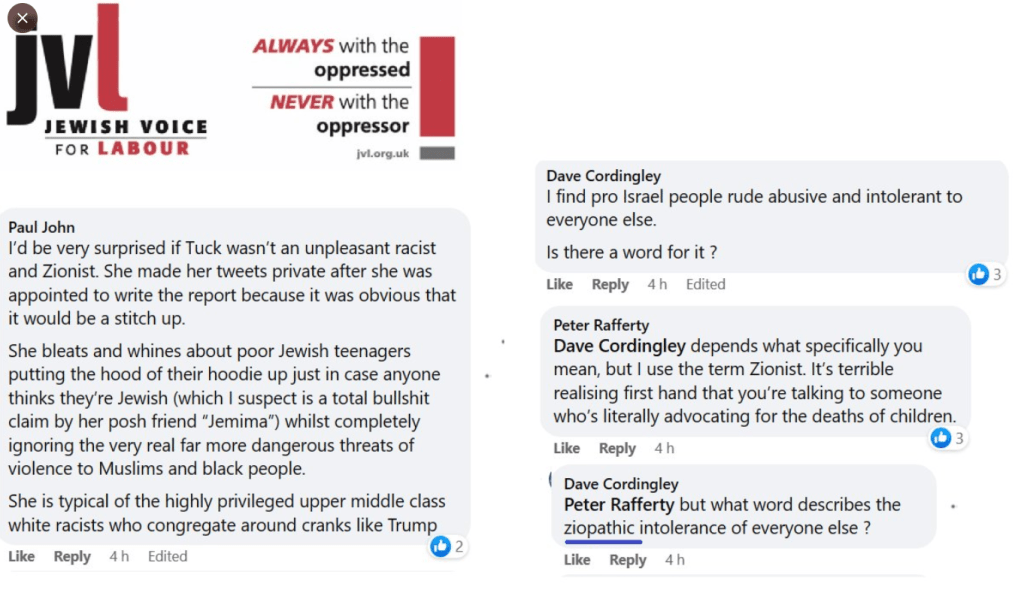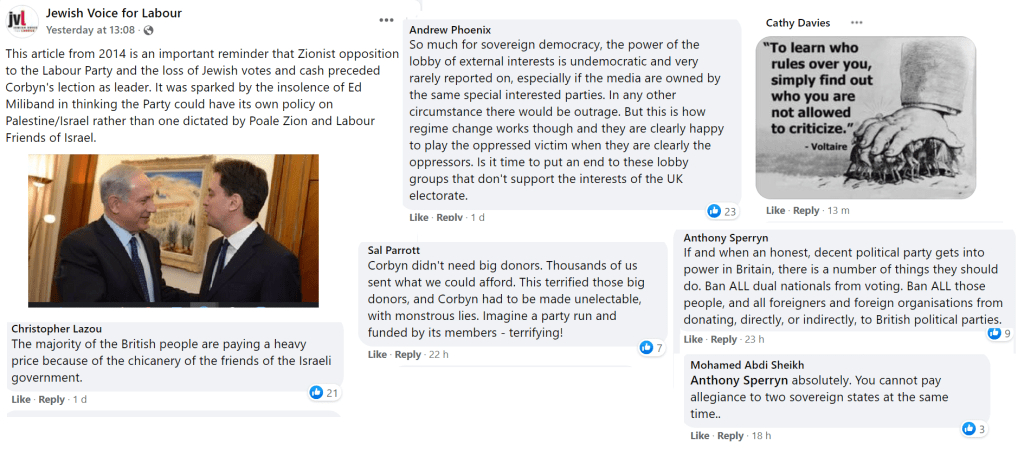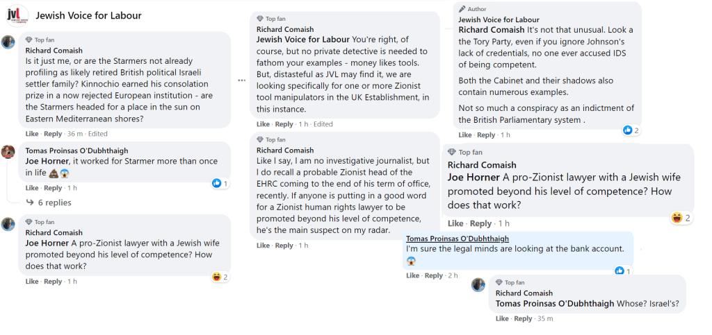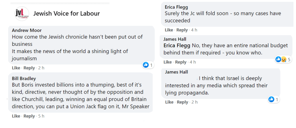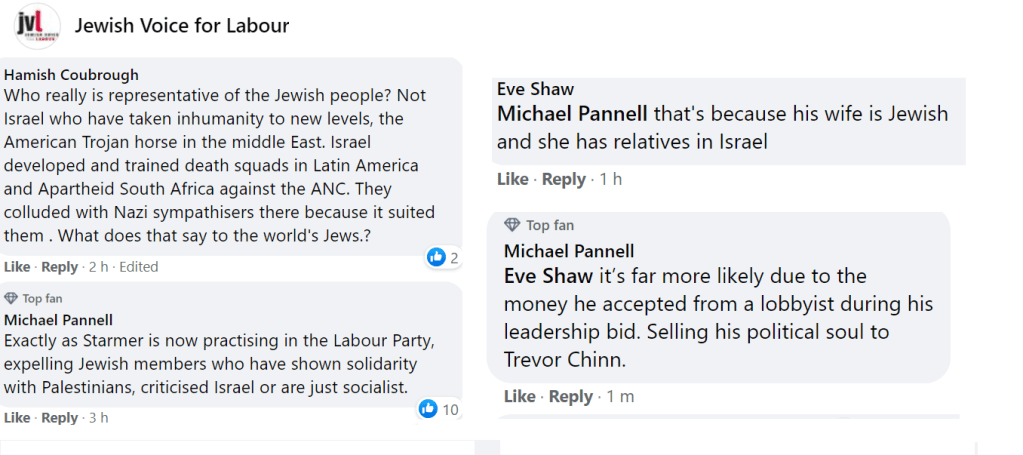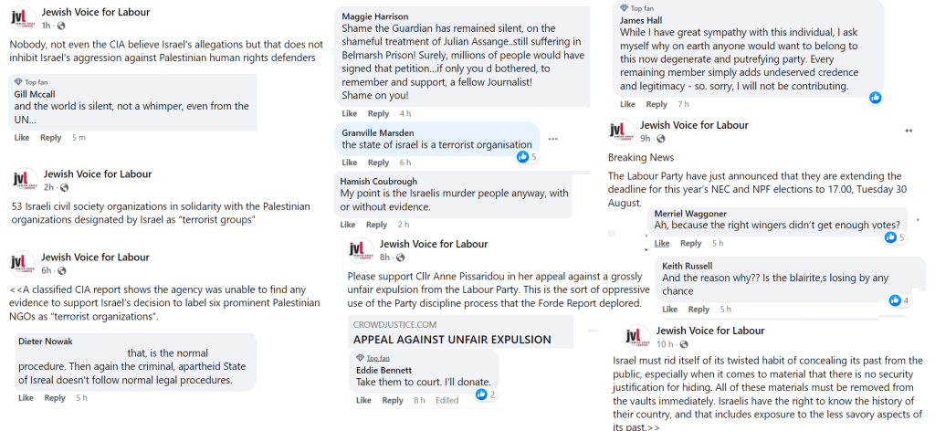 Apparently this is not the case. Friends of mine who argued back had their comments deleted. Others were blocked. If someone pushed back against an allegation against Israel by providing an article or information inconsistent with the JVL assertion, it would rarely, if ever, be left in situ. The admins are stringent in removing comments which are not explicitly anti Israel or which support their adversaries: Keir Starmer and his supporters, David Baddiel – a non-Zionist whom they call a Zionist – and the personnel of Jewish communal organizations.
