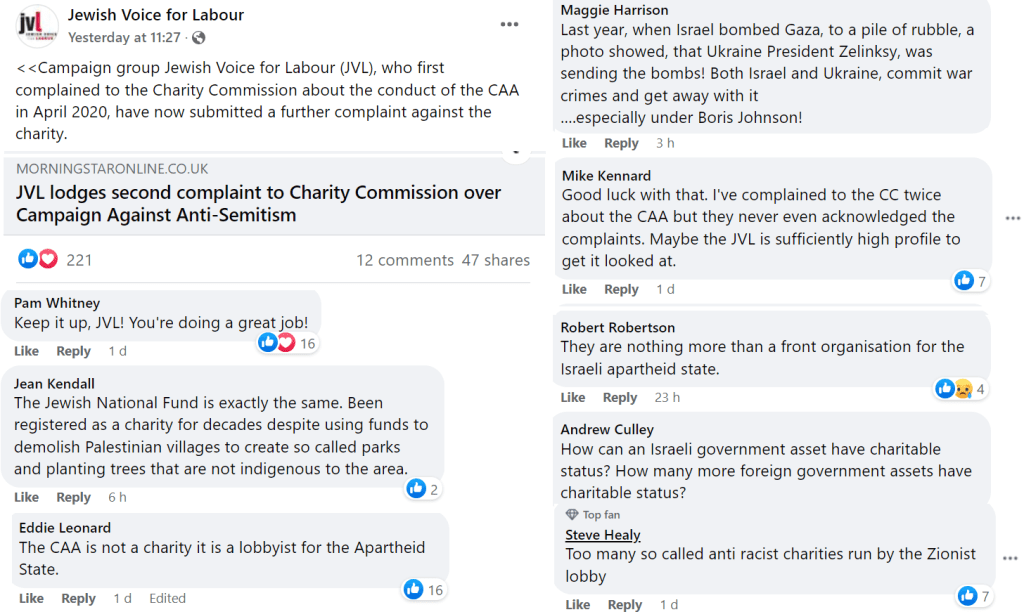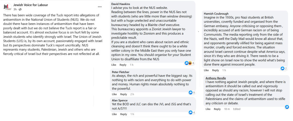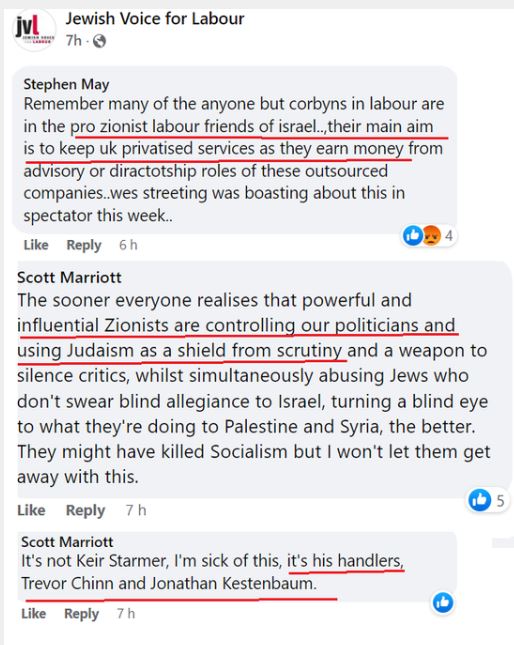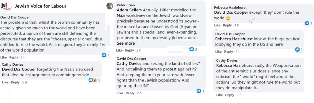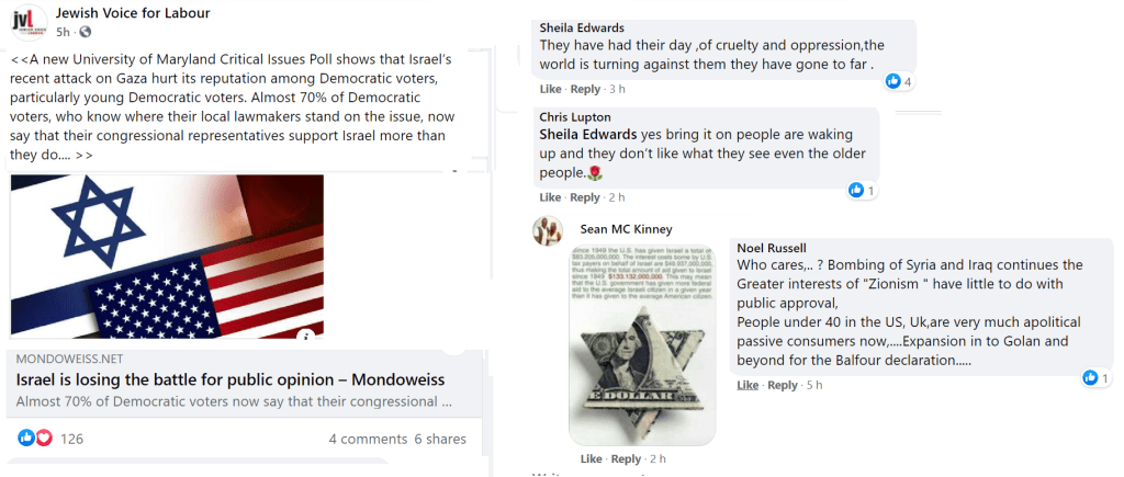 Most problematic is a dynamic in their Facebook group, now with fourteen thousand followers, where JVL will post, usually twice or three times a day, an article or information which puts Israel or opponents of antisemitism in a bad light. The replies are always somewhat more extreme than the original posts, often including old tropes and conspiracy theories about Jews. It is at such times that I would expect the JVL administrators to intervene; to explain that being anti Israel need not involve anti Jewish prejudice.