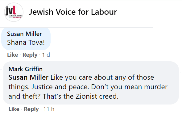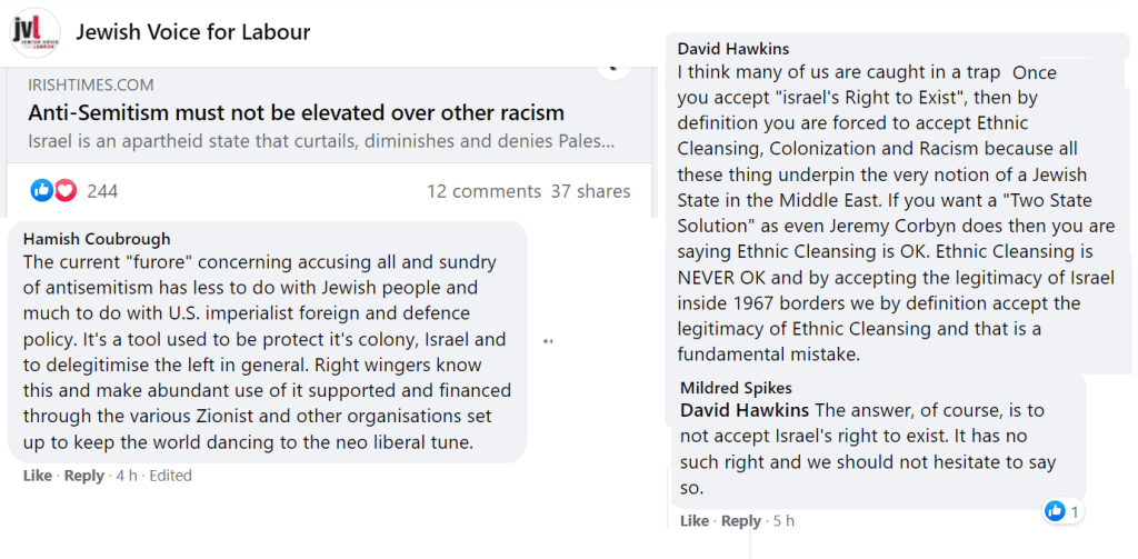 There are JVL members who have long had mutual bonds of friendship and affection with Jeremy Corbyn. Confident in his esteem, they cannot believe he ever entertains an antisemitic thought and they share his antipathy to Zionism, and to Israel, which is anathema to their diasporic vision. As their friend rose from backbench obscurity to national and possibly global celebrity, they too rose in public visibility. In this new limelight, anti Zionism became the unique selling point for JVL while, for Corbyn, it was a magnet to all kinds of enemies of Israel in larger numbers than before. I do not think JVL want to give up all this, even if it means making room in their bed for the people whose comments are shown in the screen shots below.