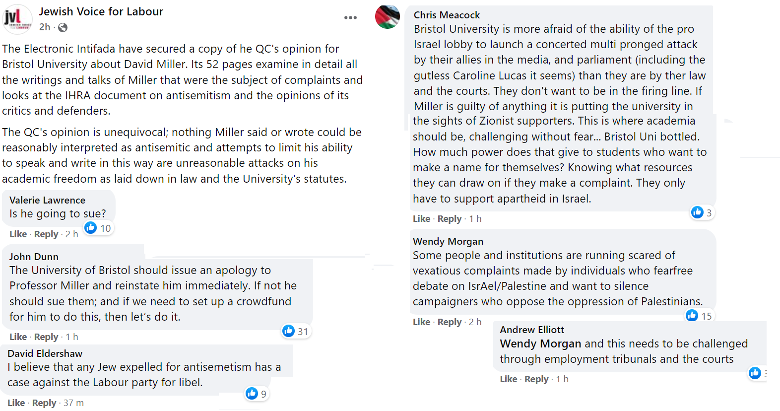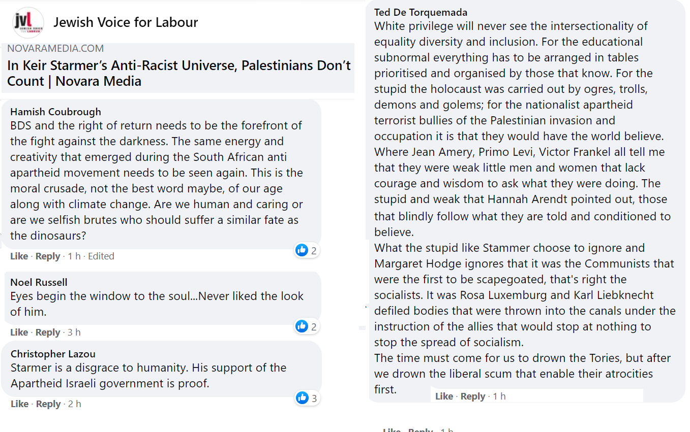 Apparently this is not the case. Friends of mine who argued back had their comments deleted. Others were blocked. If someone pushed back against an allegation against Israel by providing an article or information inconsistent with the JVL assertion, it would rarely, if ever, be left in situ. The admins are stringent in removing comments which are not explicitly anti Israel or which support their adversaries: Keir Starmer and his supporters, David Baddiel – a non-Zionist whom they call a Zionist – and the personnel of Jewish communal organizations.