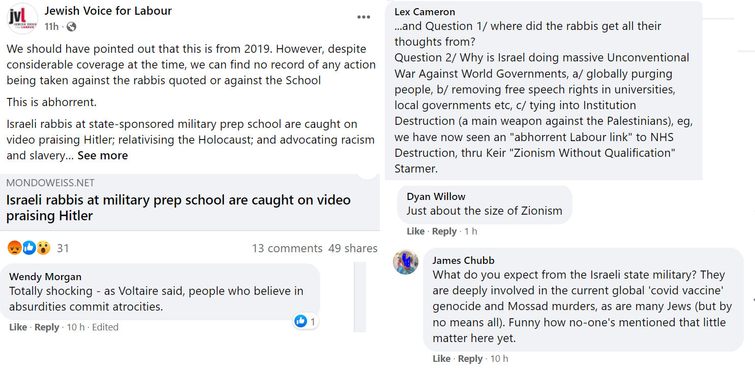 There are JVL members who have long had mutual bonds of friendship and affection with Jeremy Corbyn. Confident in his esteem, they cannot believe he ever entertains an antisemitic thought and they share his antipathy to Zionism, and to Israel, which is anathema to their diasporic vision. As their friend rose from backbench obscurity to national and possibly global celebrity, they too rose in public visibility. In this new limelight, anti Zionism became the unique selling point for JVL while, for Corbyn, it was a magnet to all kinds of enemies of Israel in larger numbers than before. I do not think JVL want to give up all this, even if it means making room in their bed for the people whose comments are shown in the screen shots below.