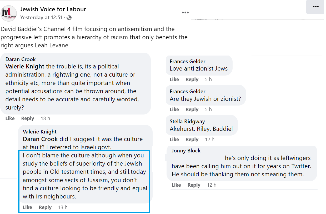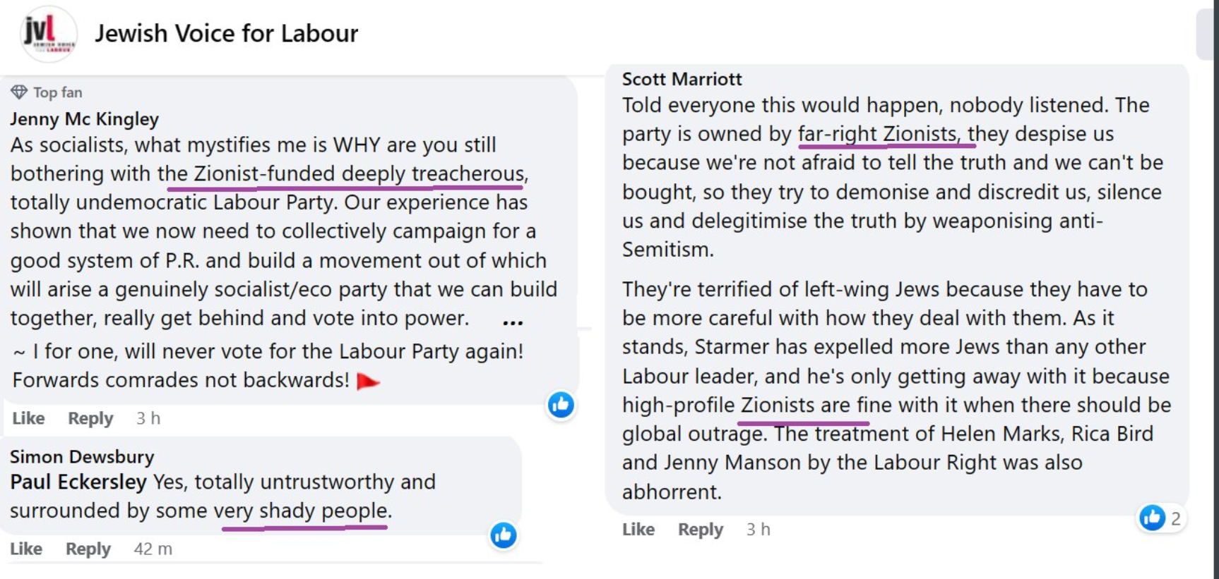 Most problematic is a dynamic in their Facebook group, now with fourteen thousand followers, where JVL will post, usually twice or three times a day, an article or information which puts Israel or opponents of antisemitism in a bad light. The replies are always somewhat more extreme than the original posts, often including old tropes and conspiracy theories about Jews. It is at such times that I would expect the JVL administrators to intervene; to explain that being anti Israel need not involve anti Jewish prejudice.