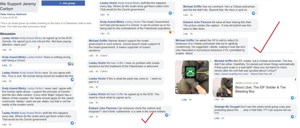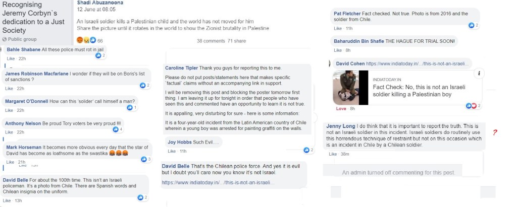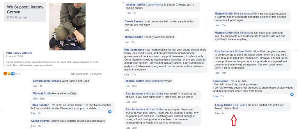 I saw the administrator of a relatively moderate Corbynist group on Facebook calling out fake news and doing it very well. I have said before that an honest, well-meaning administrator can make an enormous difference to the ethos of a Facebook group. While most of the posts on his forum concerned the tragic killing of George Floyd in Minneapolis, one post showed a soldier or policeman kneeling on an injured child and the text below the photo stated that the officer was an Israeli killing a Palestinian. The Spanish words on the officer’s uniform did make me wonder about the location of the event but Michael the administrator went further and identified the uniform as Chilean. Someone else researched the picture and found that the child, thankfully, survived. Members of the group were not one whit interested in the photo being from Chile. On the contrary, they continued to talk of the Israeli’s brutality and the murder of the child. To his credit, Michael and others as shown, explained over and over that the photo was not from Israel. My screen shots below show the trajectory of the ensuing conversation.