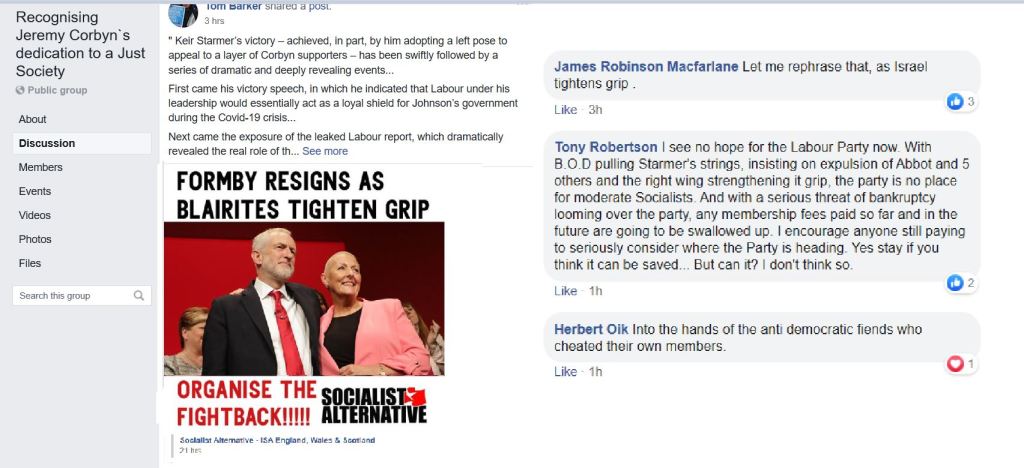 When, two months ago, I read through the voluminous pages of the leaked report, I saw mention of a topic close to my own heart. Ms Formby had appealed to Facebook to take down some of the grossly antisemitic groups which used Jeremy Corbyn’s name and picture as a selling point, to attract members. One of the most extreme groups, Truthers Against Zionists [sic] Lobbies was closed down in December 2019 and its administrator, Rita Allison, was suspended or expelled from the Labour Party. According to her recent tweets, Ms Allison considers that Zionists caused the closure of hard line Corbynist groups on Facebook. Rachel Riley is mentioned by Jennie Formby as having reported the Truthers group to Facebook. I had done so myself, many times. Numerous people reported Truthers Against Zionists Lobbies to Facebook for its frequent holocaust denial, antisemitic cartoons and Hitler apologetics. Nevertheless, it seems that Ms Formby struck the coup de grace and that is to her credit.