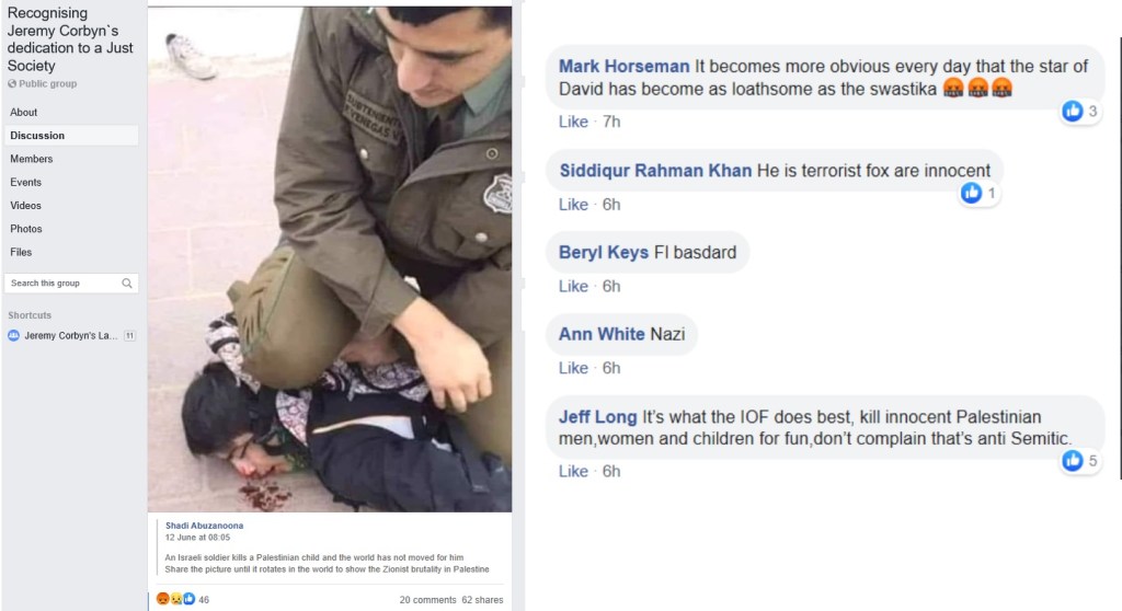 Some weeks later, on 7 July, the same photo appeared on another forum, ‘Jeremy Corbyn Should Have Been Prime Minister.’ This time, nobody saw the Spanish writing on the wall and the comrades got stuck in against Israel, at will.
