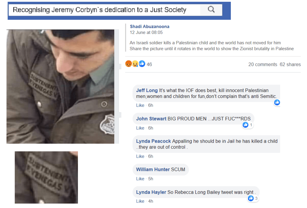 Regarding what I would say about a hypothetical homicide perpetrated by an Israeli officer on a Palestinian: the answer is that I would say nothing if I read it in Middle East Monitor, MintPress, Skwawkbox, The Canary or Electronic intifada. Such stories appear daily in the Corbynist groups I follow on Facebook and the source is usually one of the above. Sometimes it is Haaretz, the Israeli newspaper which is increasingly referenced on anti-Israel sites, due to its opposition to the settlements and to Mr Netanyahu’s government. Perceived affinities between these bêtes noires can cause an overlap in subject matter. Thus, expressions of solidarity with black Americans may segue into threads about Trump’s alliance with Netanyahu or his regard for Boris Johnson.