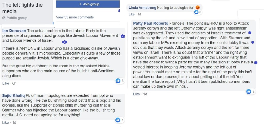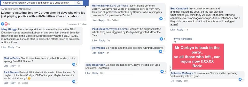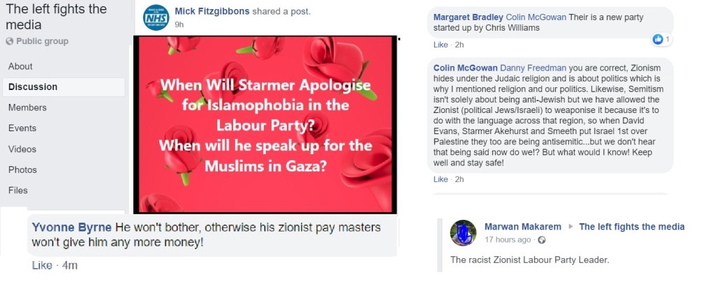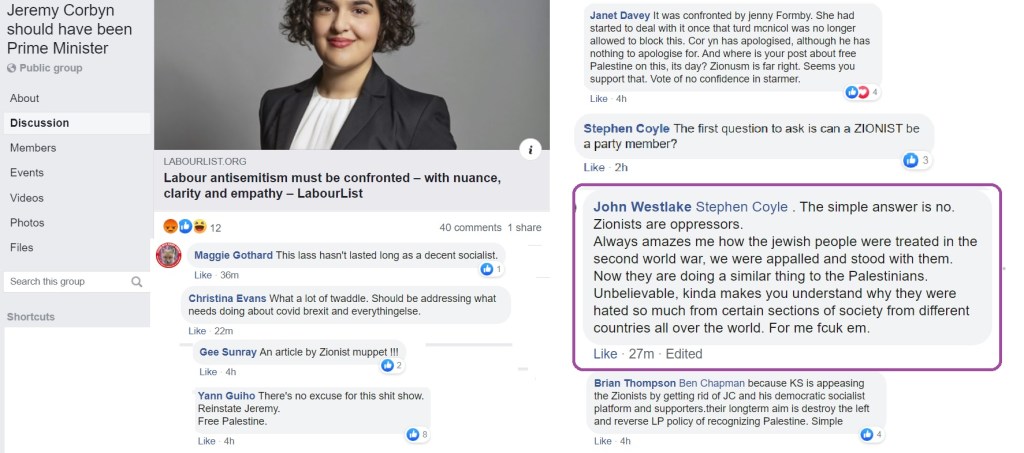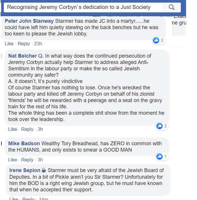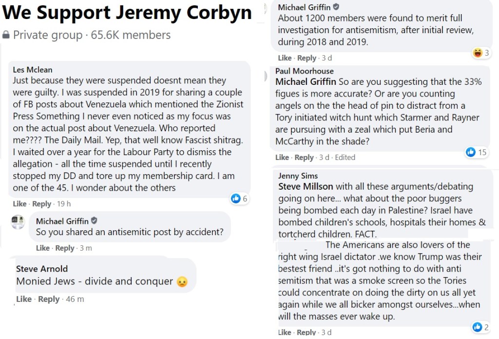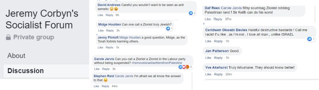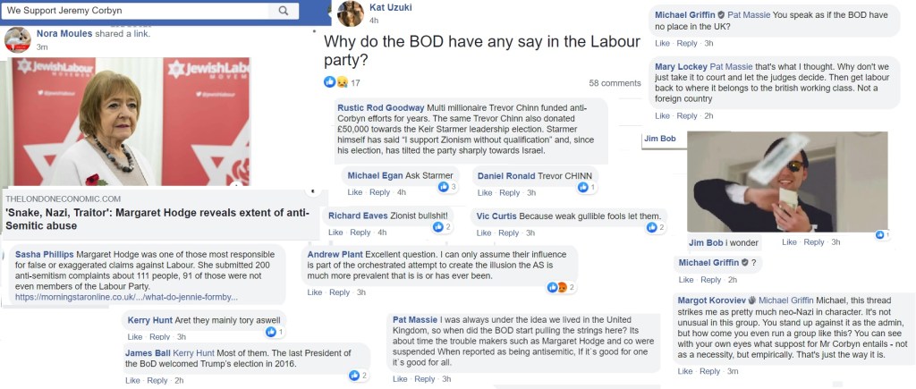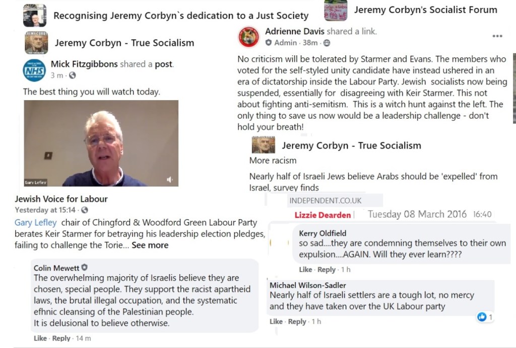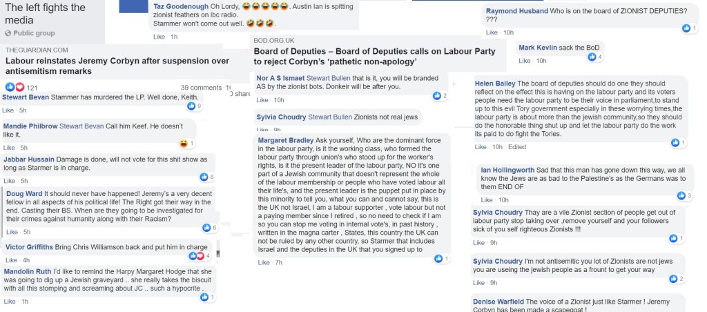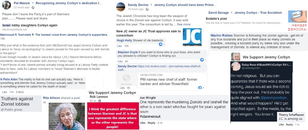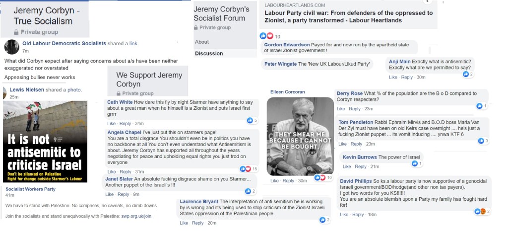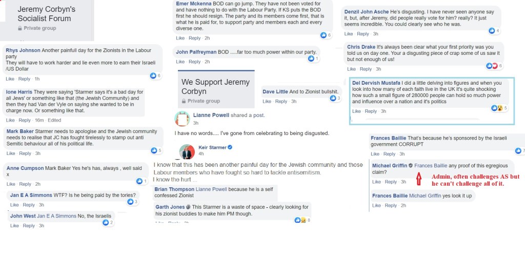 Flitting between Corbynist forums, I’m not always able to get an impression about which groups are more intensely antisemitic than others and besides, the groups have a fluidity, often very much affected by the administrators. One forum was highly antisemitic, then somebody left and the remaining administrator was pro-Starmer. The group is still well to my left but it isn’t antisemitic.