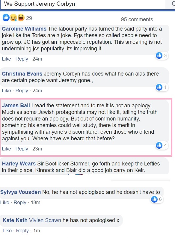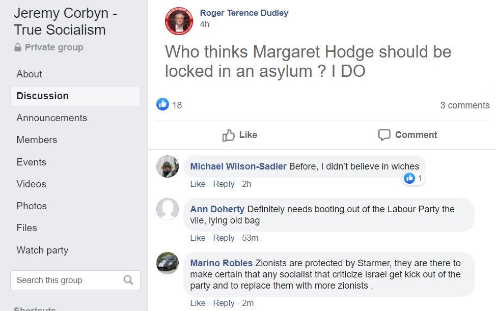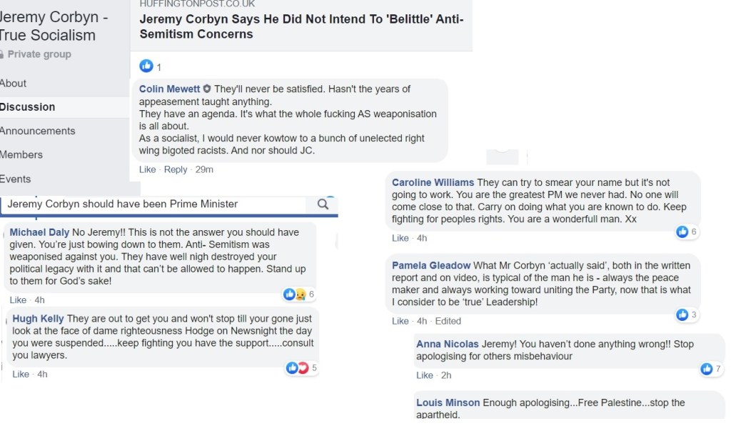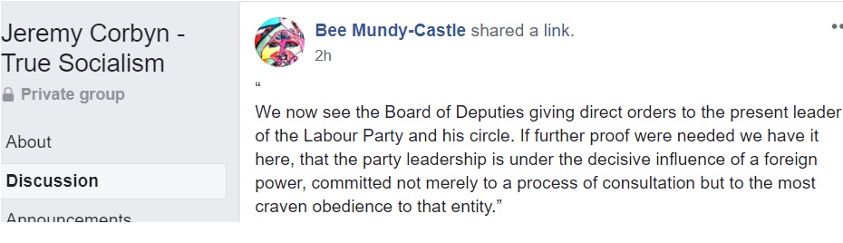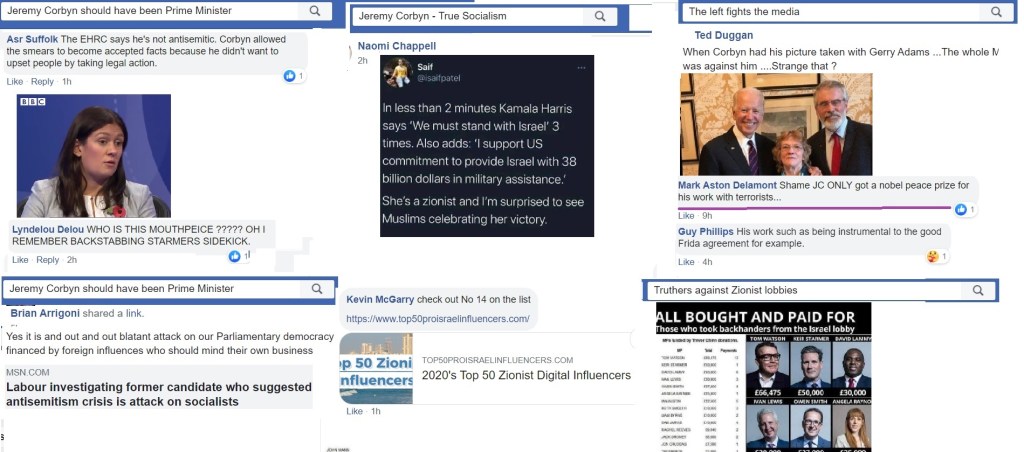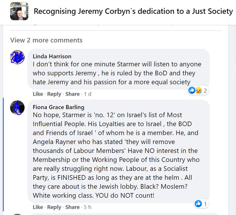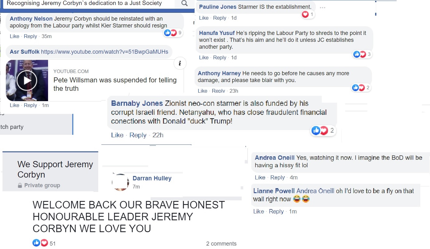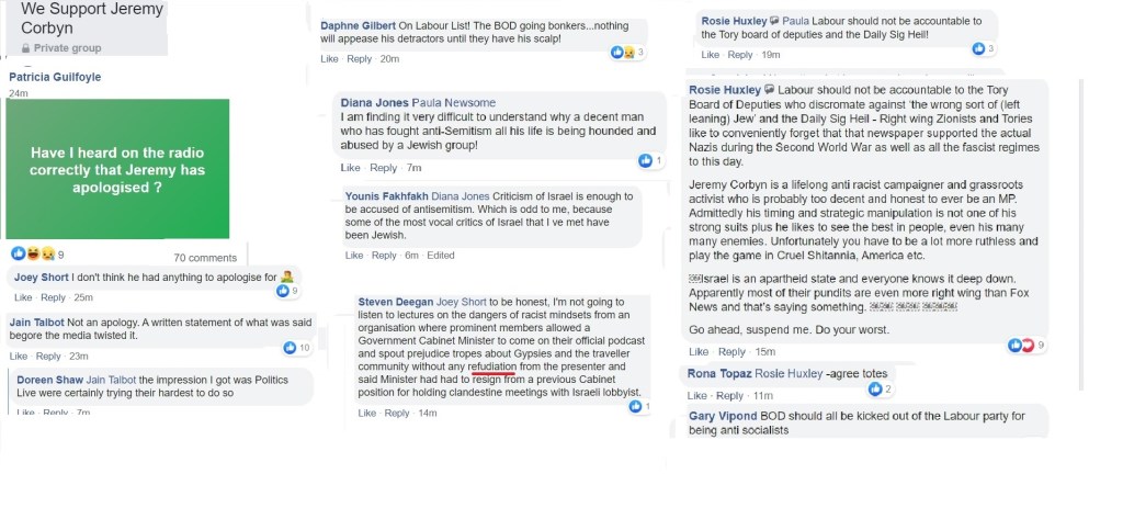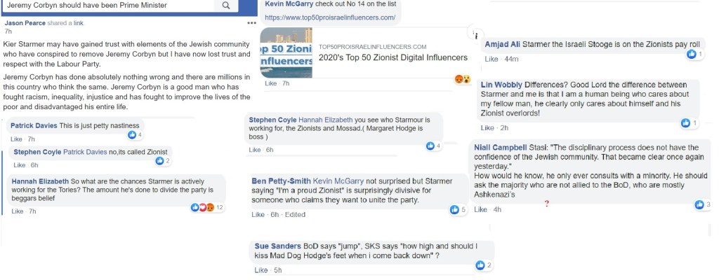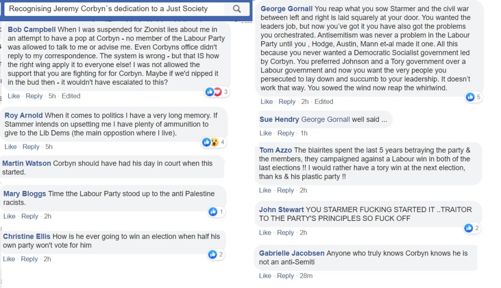 Flitting between Corbynist forums, I’m not always able to get an impression about which groups are more intensely antisemitic than others and besides, the groups have a fluidity, often very much affected by the administrators. One forum was highly antisemitic, then somebody left and the remaining administrator was pro-Starmer. The group is still well to my left but it isn’t antisemitic.