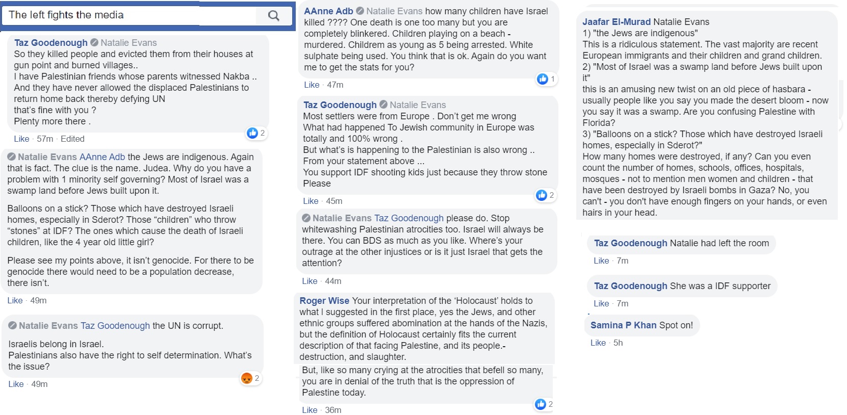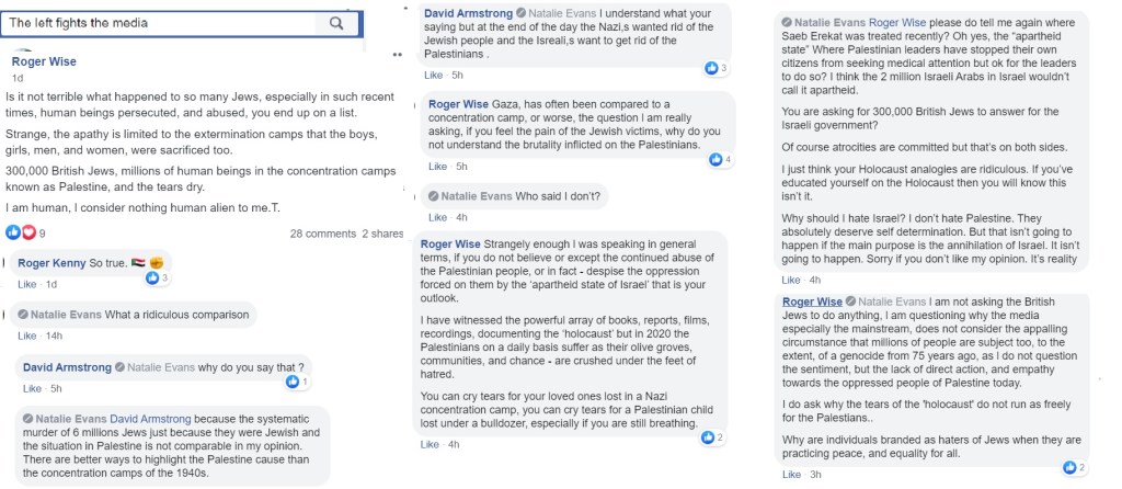 Through Twitter, I met Natalie Evans, who works as a volunteer in Holocaust education. Natalie, a Labour supporter, had joined a forum called The Left Fights the Media and became aware quickly of the rampant antisemitism and misinformation in the group. She stayed in the group to argue back and was finally expelled last night, after questioning their received opinion that a holocaust was occurring in Gaza, perpetrated by he Israelis and equal in extent to the Shoah.