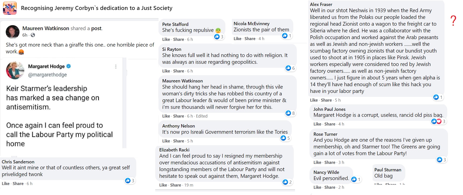 Not one of the contributors would admit to antisemitism. They justify their venom by accusing Margaret Hodge of a variety of sins, venial and mortal. When one of them pointed out that she belongs to ‘a group of people who love money’, my acquaintance Margot Koroviev asked them to be explicit. ‘Fascist Zionists’ was the answer, lest anyone might think they meant Jews. Margaret Hodge’s greatest sin, in their eyes, is alleging that antisemitism became a force to be reckoned with in the Labour Party under the leadership of Jeremy Corbyn. They will agree that it may have been present before Corbyn and possibly under Starmer but Jeremy, they insist, was the one person who defended the ungrateful Jews.