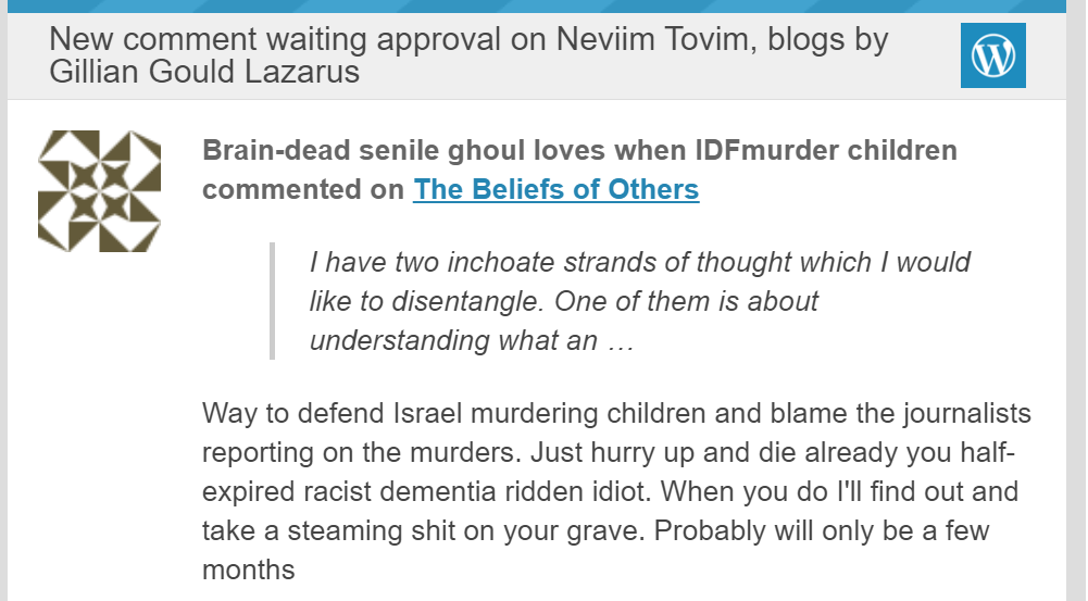 As if to illustrate my point that other people’s beliefs are not always comprehensible, even if one could know them, a very toxic troll commented on this blog post, as shown. I trashed the comment, but display it here, as an example of the unknowable Other.