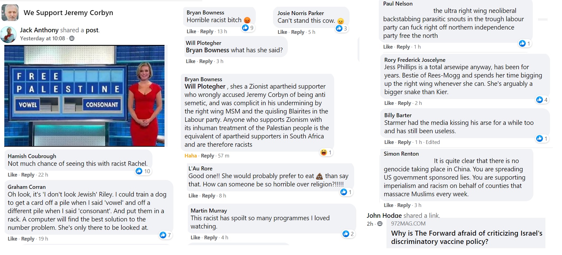 These Corbynist forums, not always Labour as their members have mostly left the Party, are locations where the members can express gross, insulting comments about people they dislike: Keir Starmer, any Conservative, any Centrist, Israel, the Board of Deputies, Margaret Hodge.