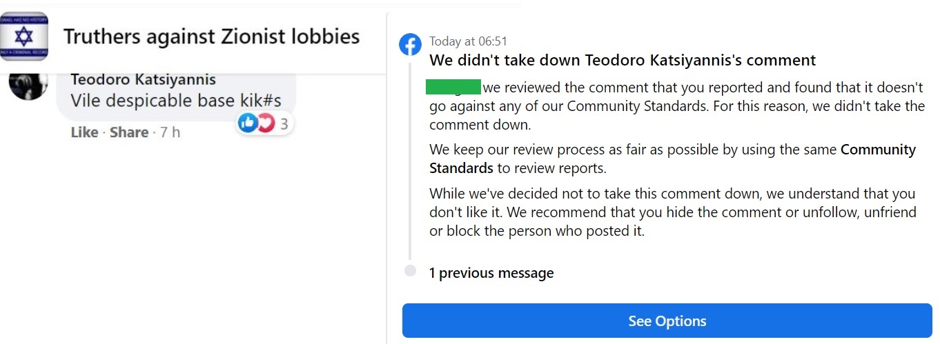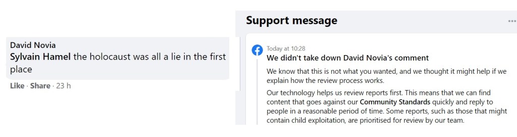 I report to Facebook and Twitter some of the posts which I consider grossly antisemitic.The reply from Twitter is usually ‘Thank you. This violated our rules against hate speech,’ but the violating account persists in its racist timbre. Facebook tends to reply,’This does not violate our community standards,’ as shown below.