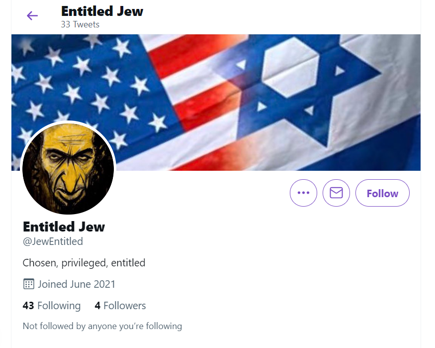 My attention was drawn by Gnasher Jew, a team of Jewish activists devoted to exposing antisemitism of left and right, to this new Twitter account . The cover picture with its proximity of Israeli and American flags is not unusual, but the avatar belongs very much to historical anti-Jewish imagery, so much so that I suspect even those who praised Mear One’s notorious mural might see that something here is amiss. ‘Entitled Jew’ is an account launched just this month, perhaps even this week, conceivably by someone already experienced in the highways and byways of Twitter.