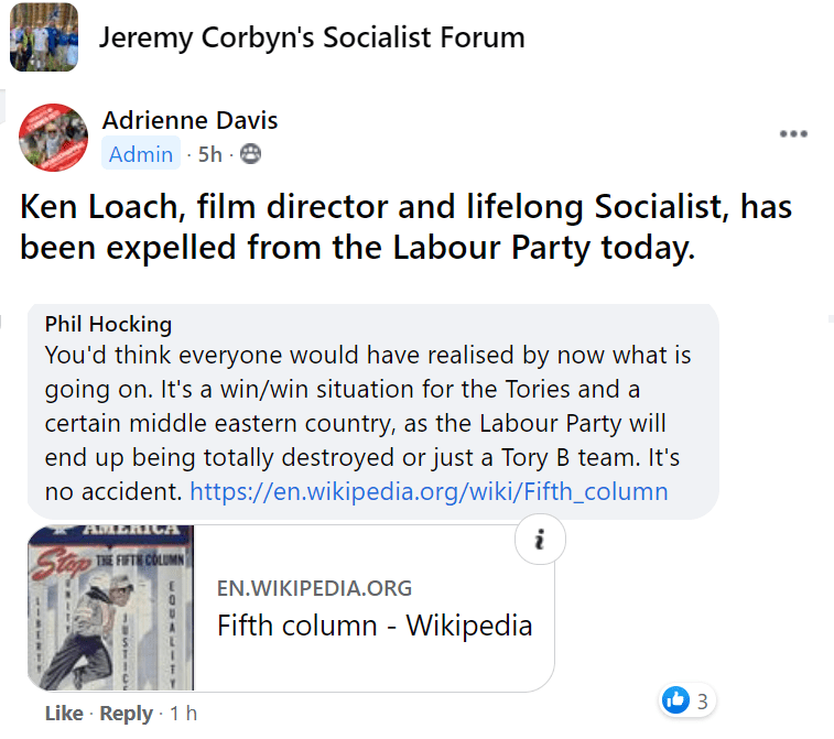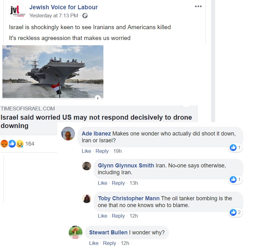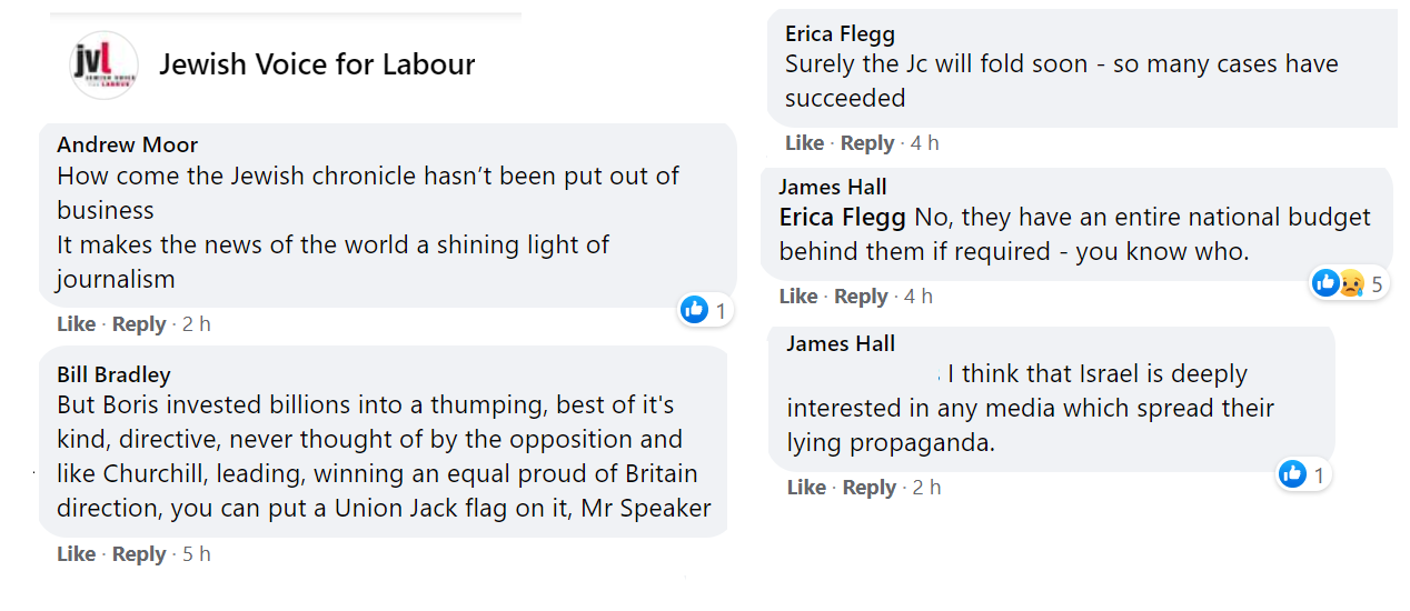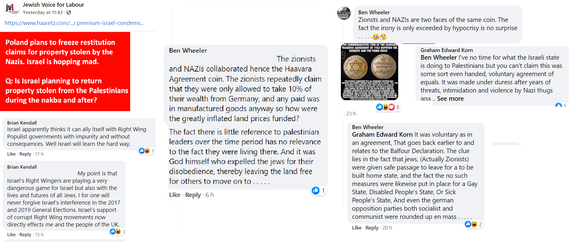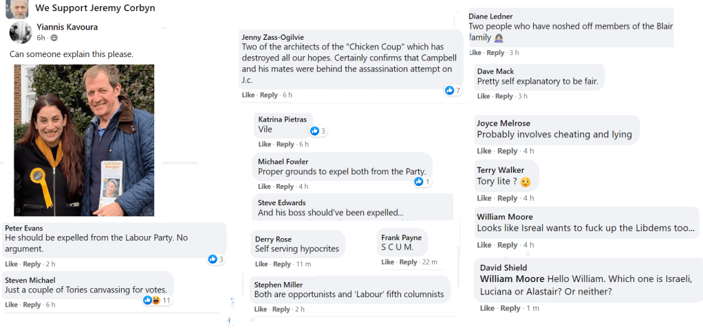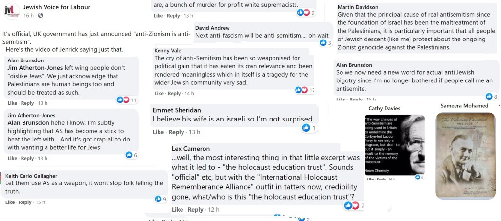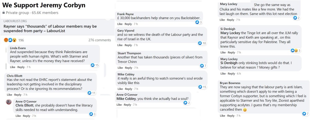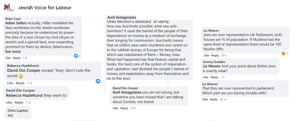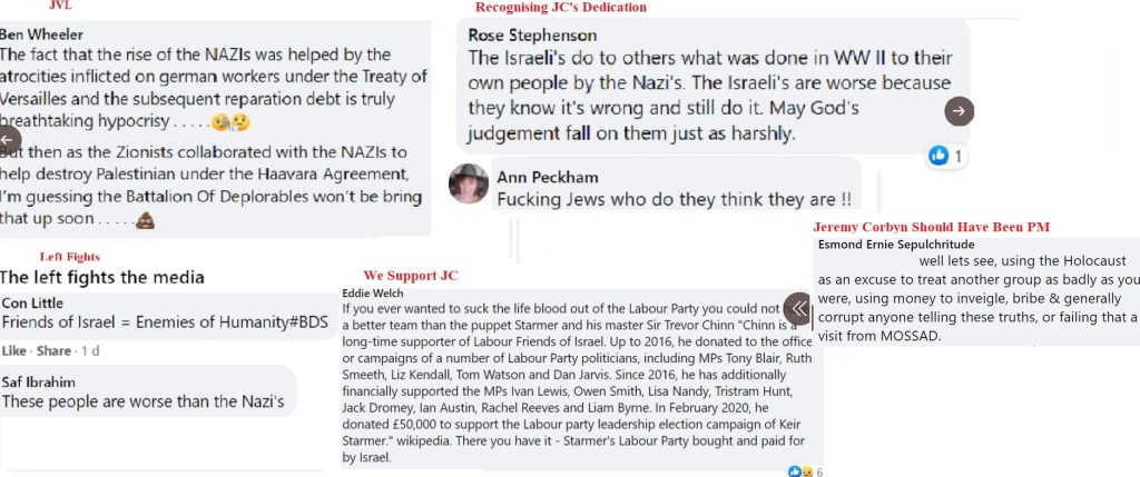 JVL – the oddly named Jewish Voice for Labour – is problematic in a slightly different way. The items posted by JVL, while intensely anti Israel, are not necessarily antisemitic but they specialize in defending anyone who has been accused of antisemitism, if they have been associated with Labour or with Mr Corbyn. Their non-Jewish followers post material as extreme as that on any other forum. If this is confronted by some interloper, the JVL moderators tend to delete the dissident posts; thus, friends of mine who argue against overtly anti Jewish comments find that their replies disappear, censored by JVL.