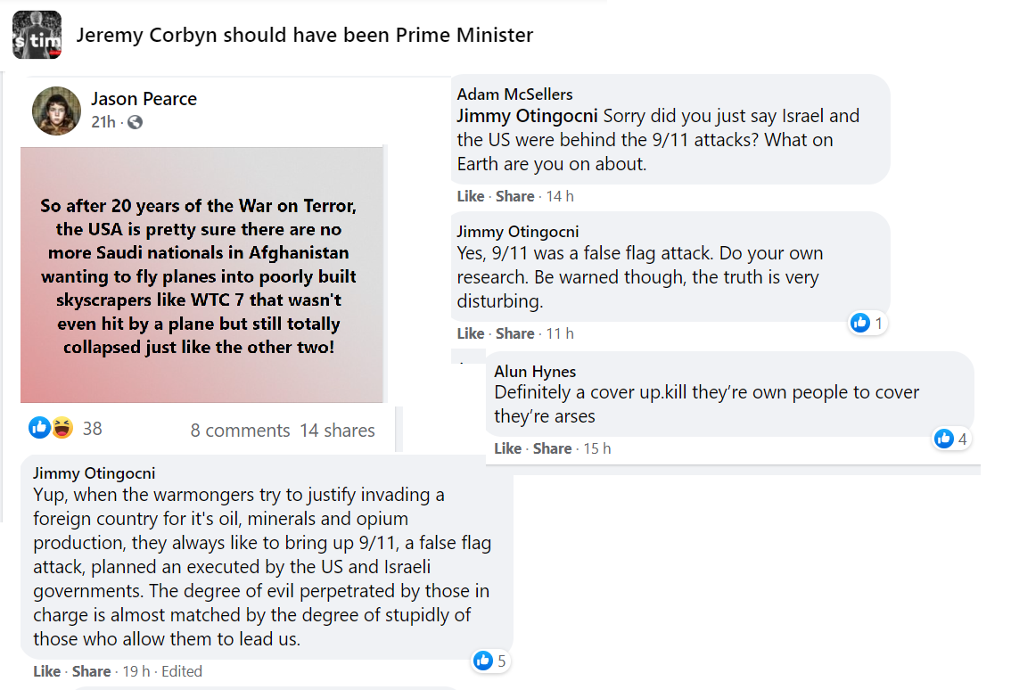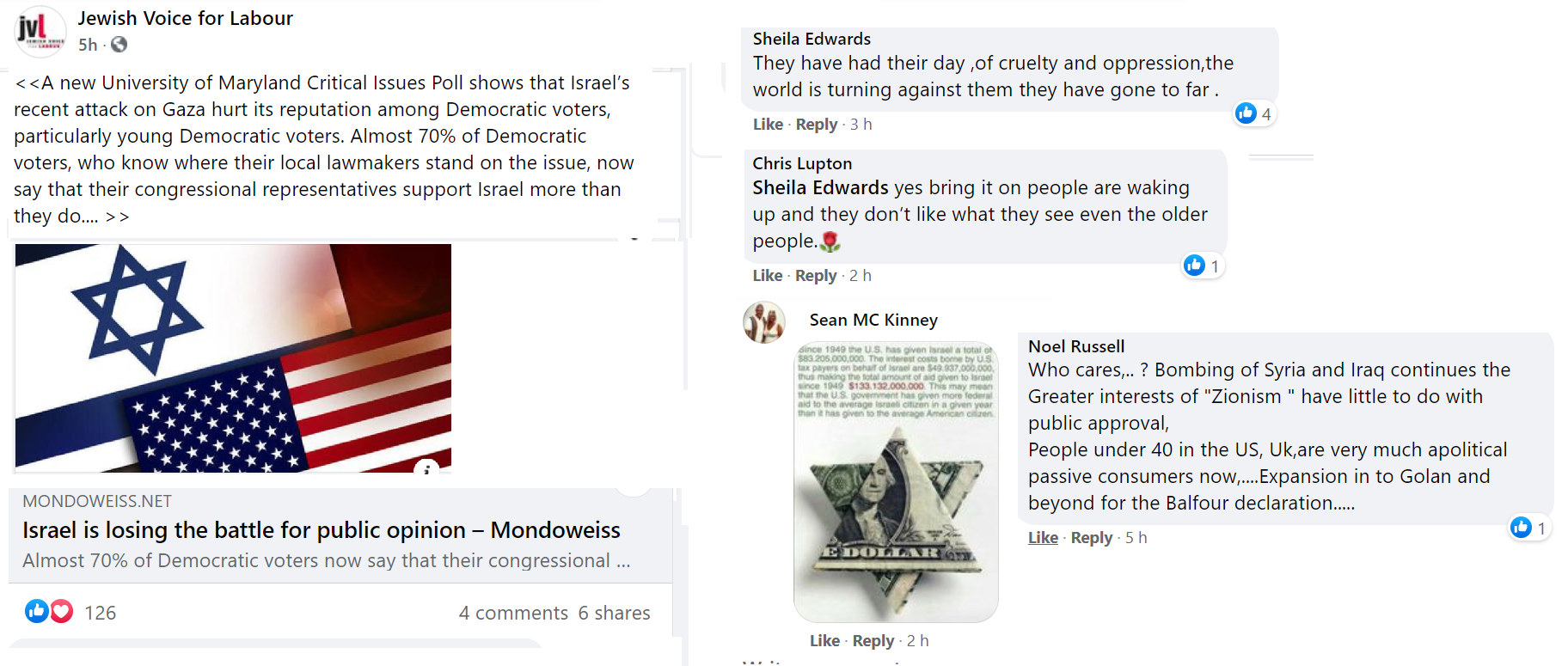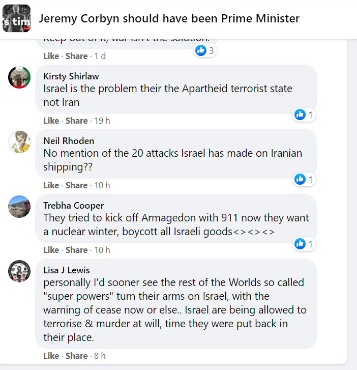 are included in some of the ‘mixed’ screen shots. Truthers Against Zionist Lobbies originally used a cover photo of Jeremy Corbyn but they have changed this to a Star of David with the superscription ‘Israel has no history, only a criminal record’. I have not included their work among the screen shots below, except in one of the mixed collages.