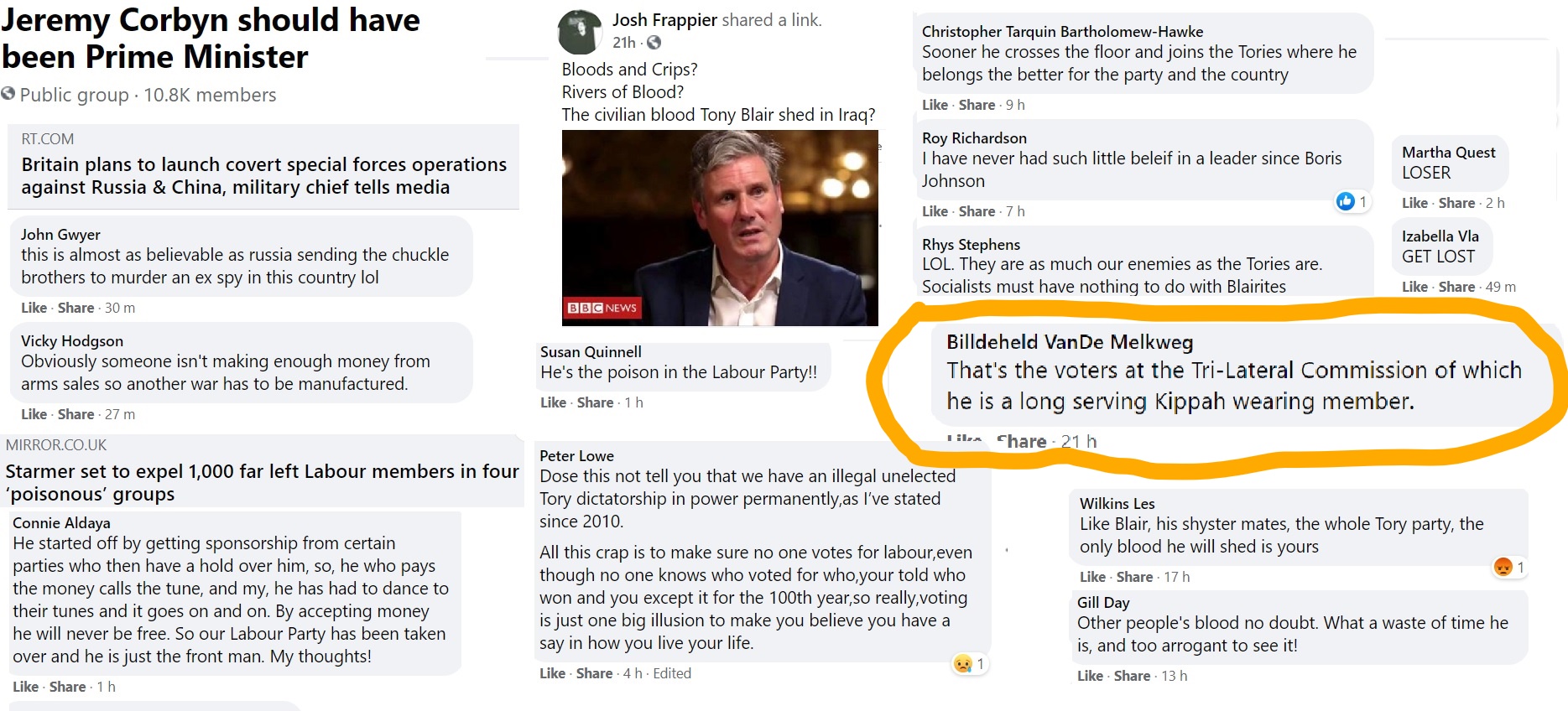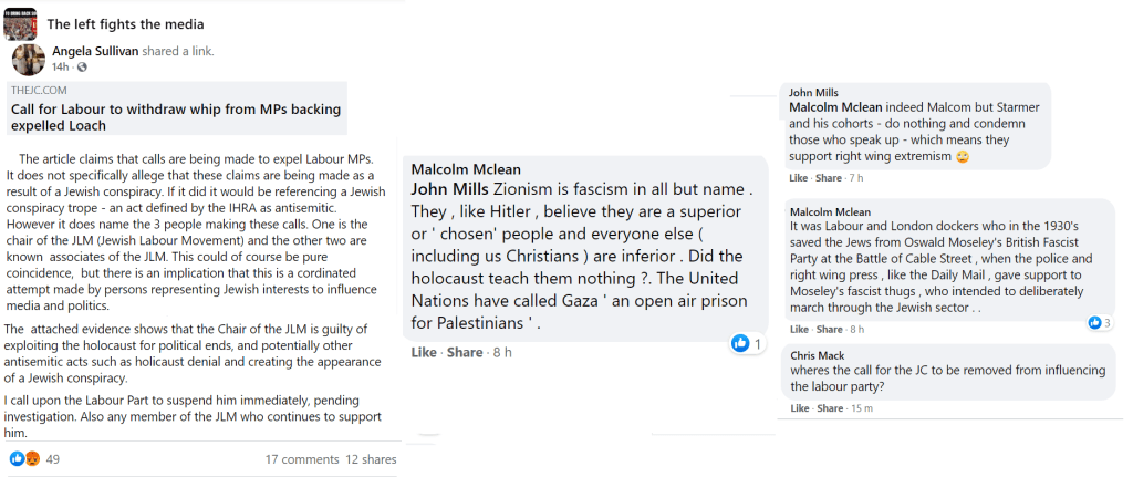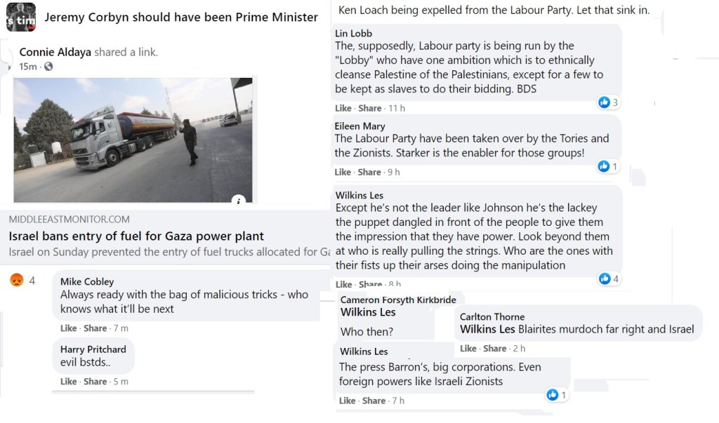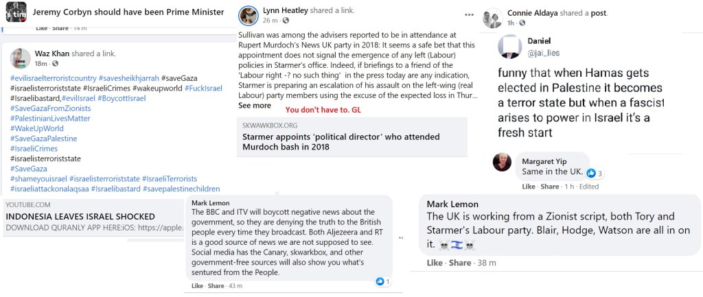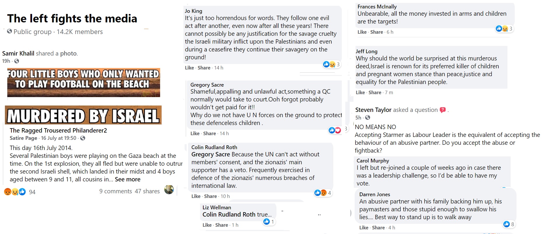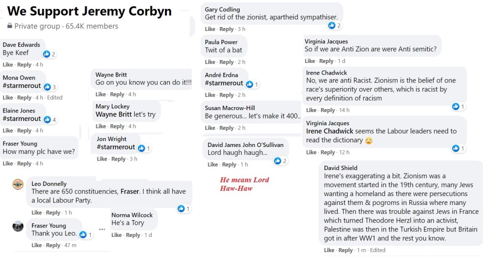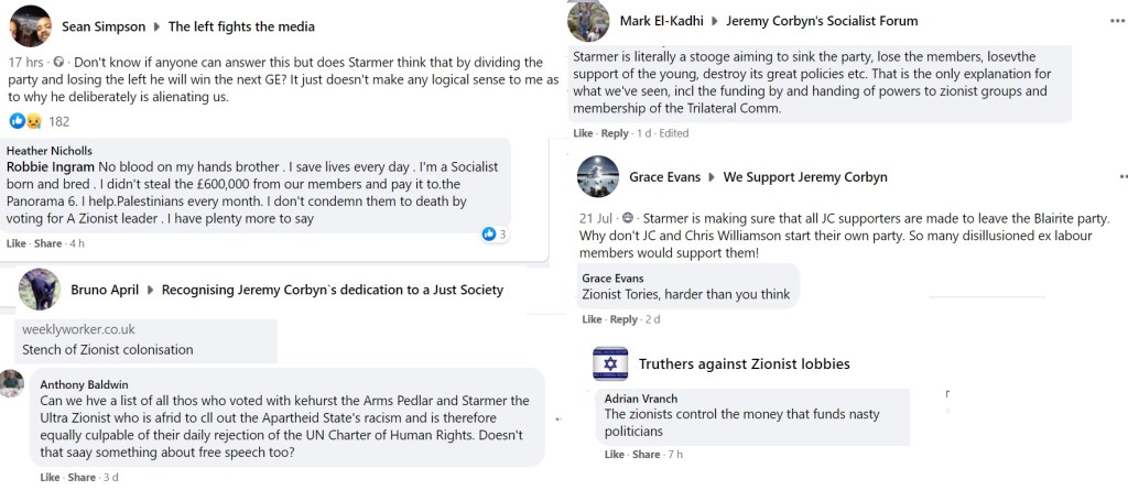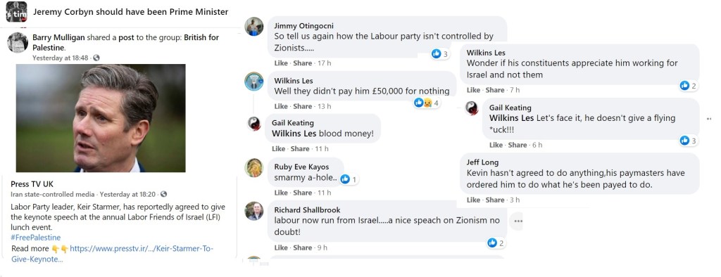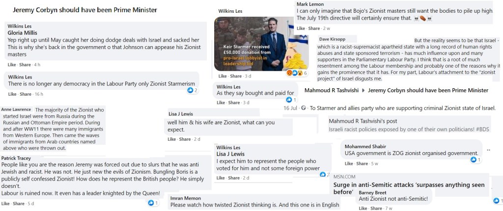 Most certainly, discussions about Israel, Zionism and Jews dominate the left wing Facebook forums where foreign affairs are concerned. Regarding UK politics, the posts concern mostly the wrongdoings of Boris Johnson and Tory Ministers and the alleged treacheries and failures of Keir Starmer. The Starmer threads almost invariably make reference to the influence of either Israel or the Board of Deputies of British Jews.