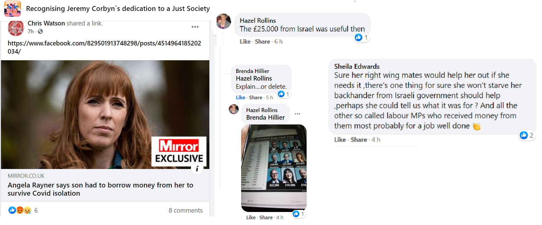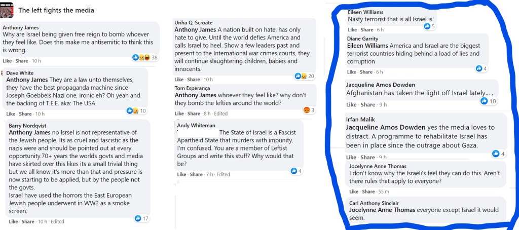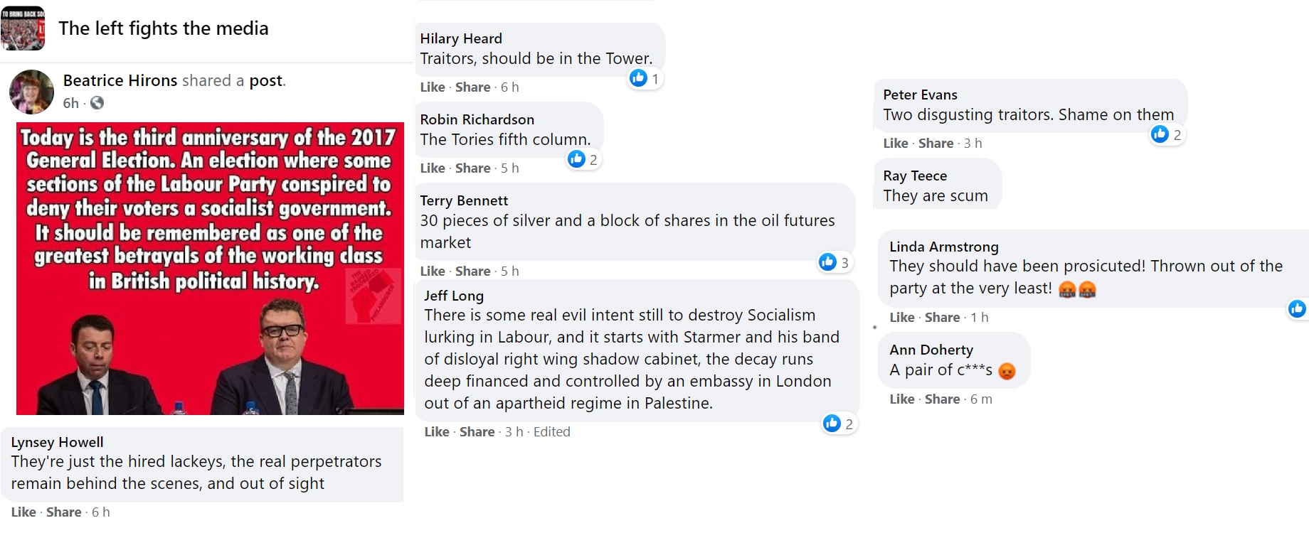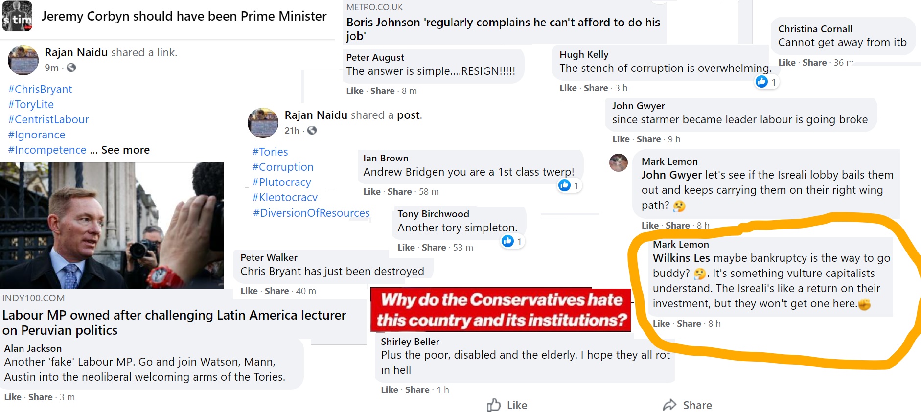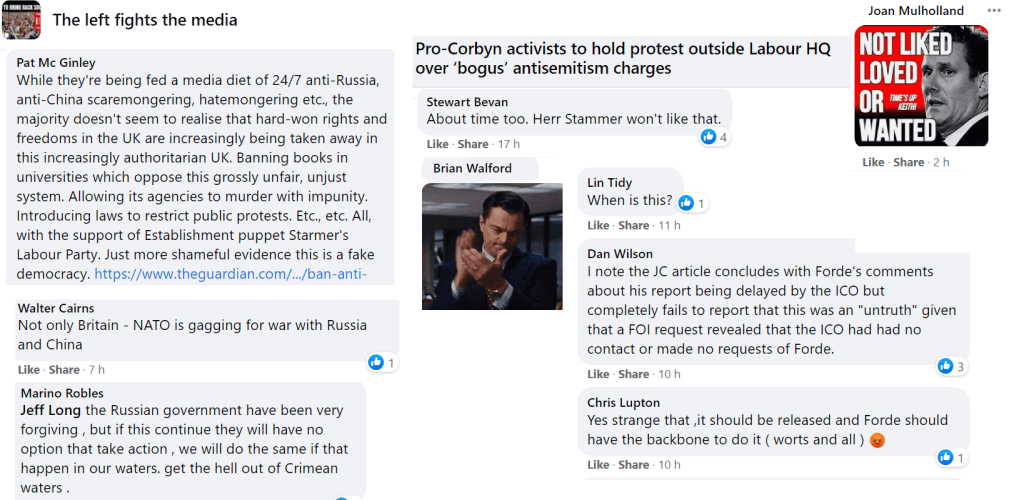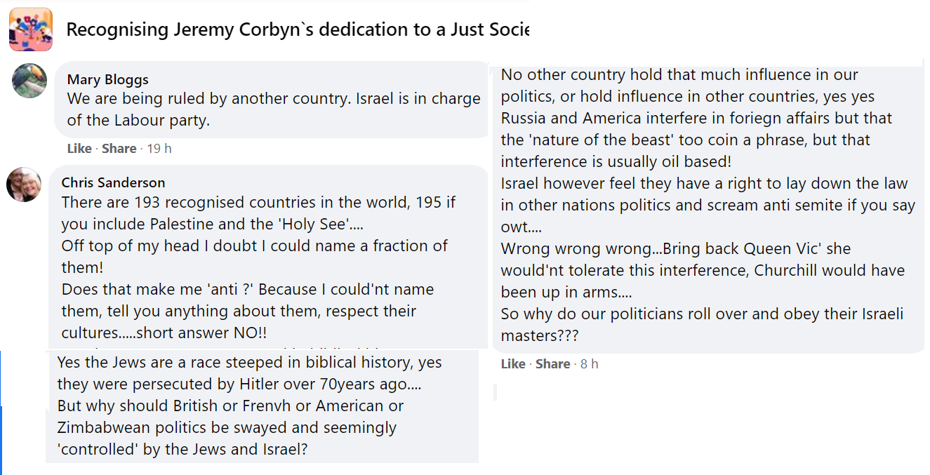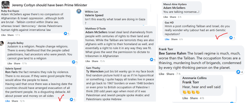 Most certainly, discussions about Israel, Zionism and Jews dominate the left wing Facebook forums where foreign affairs are concerned. Regarding UK politics, the posts concern mostly the wrongdoings of Boris Johnson and Tory Ministers and the alleged treacheries and failures of Keir Starmer. The Starmer threads almost invariably make reference to the influence of either Israel or the Board of Deputies of British Jews.