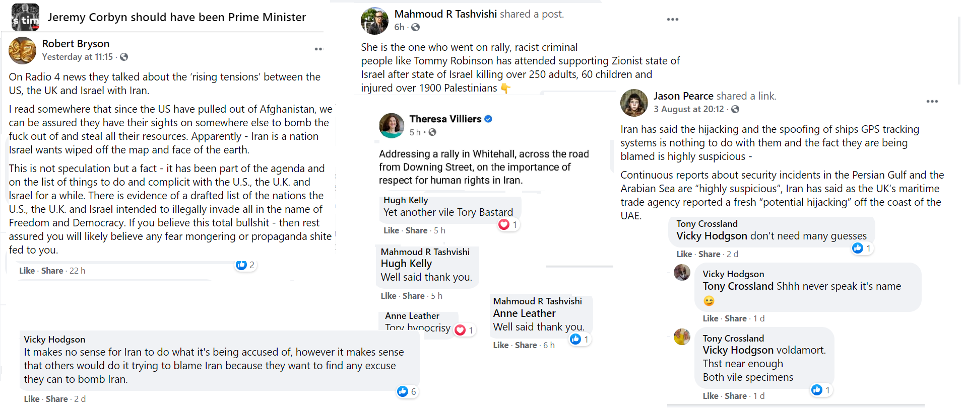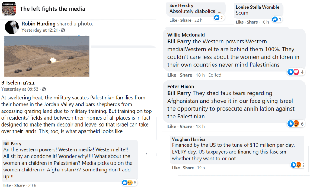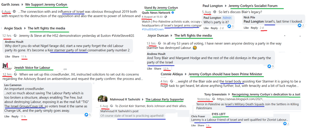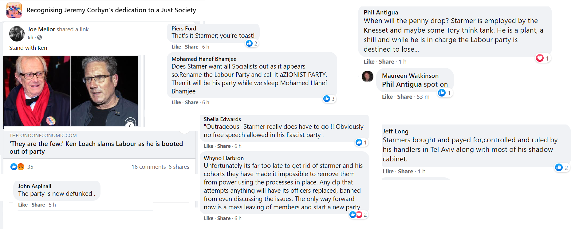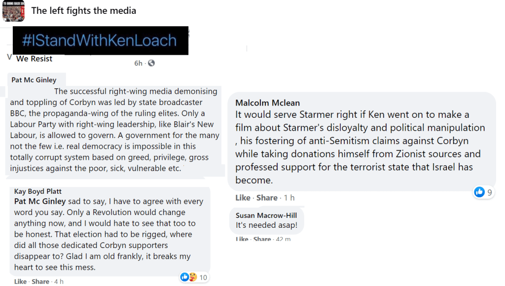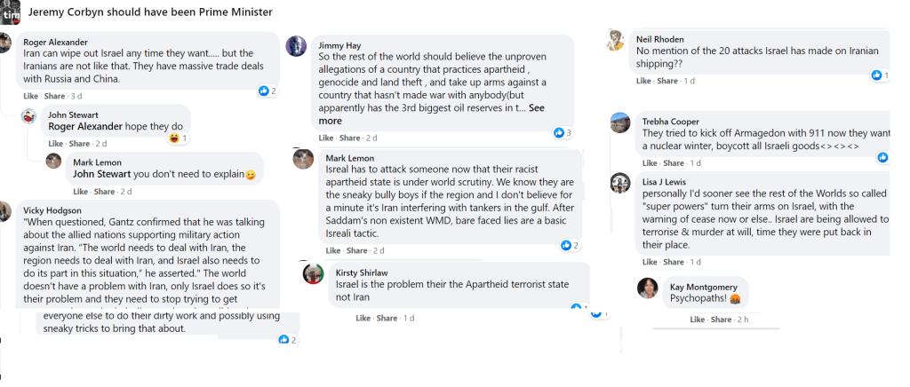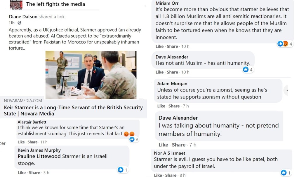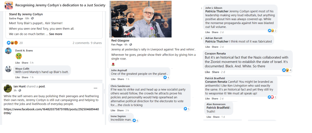 Most certainly, discussions about Israel, Zionism and Jews dominate the left wing Facebook forums where foreign affairs are concerned. Regarding UK politics, the posts concern mostly the wrongdoings of Boris Johnson and Tory Ministers and the alleged treacheries and failures of Keir Starmer. The Starmer threads almost invariably make reference to the influence of either Israel or the Board of Deputies of British Jews.