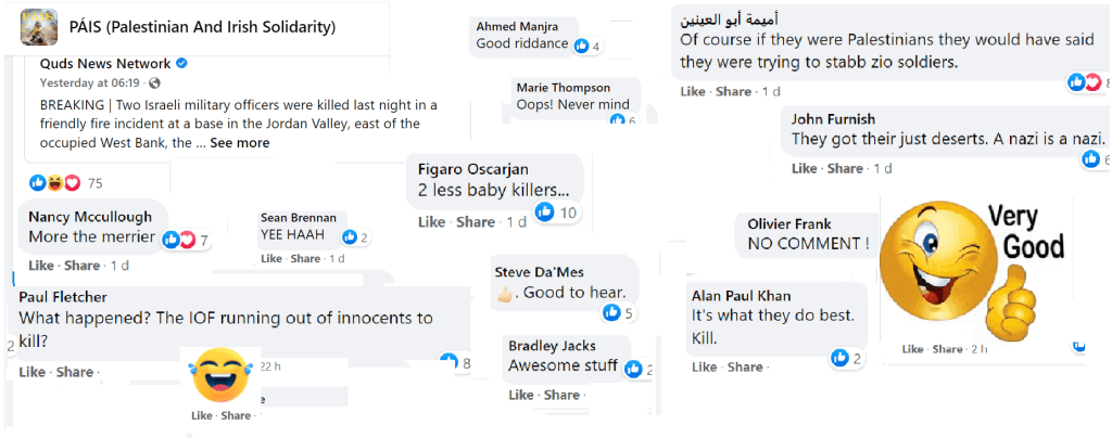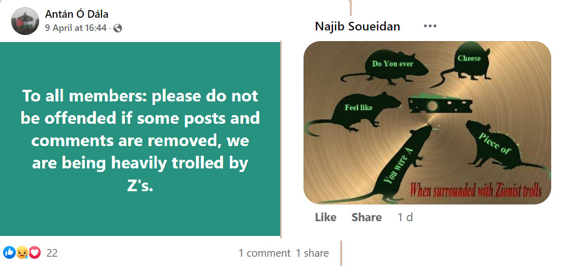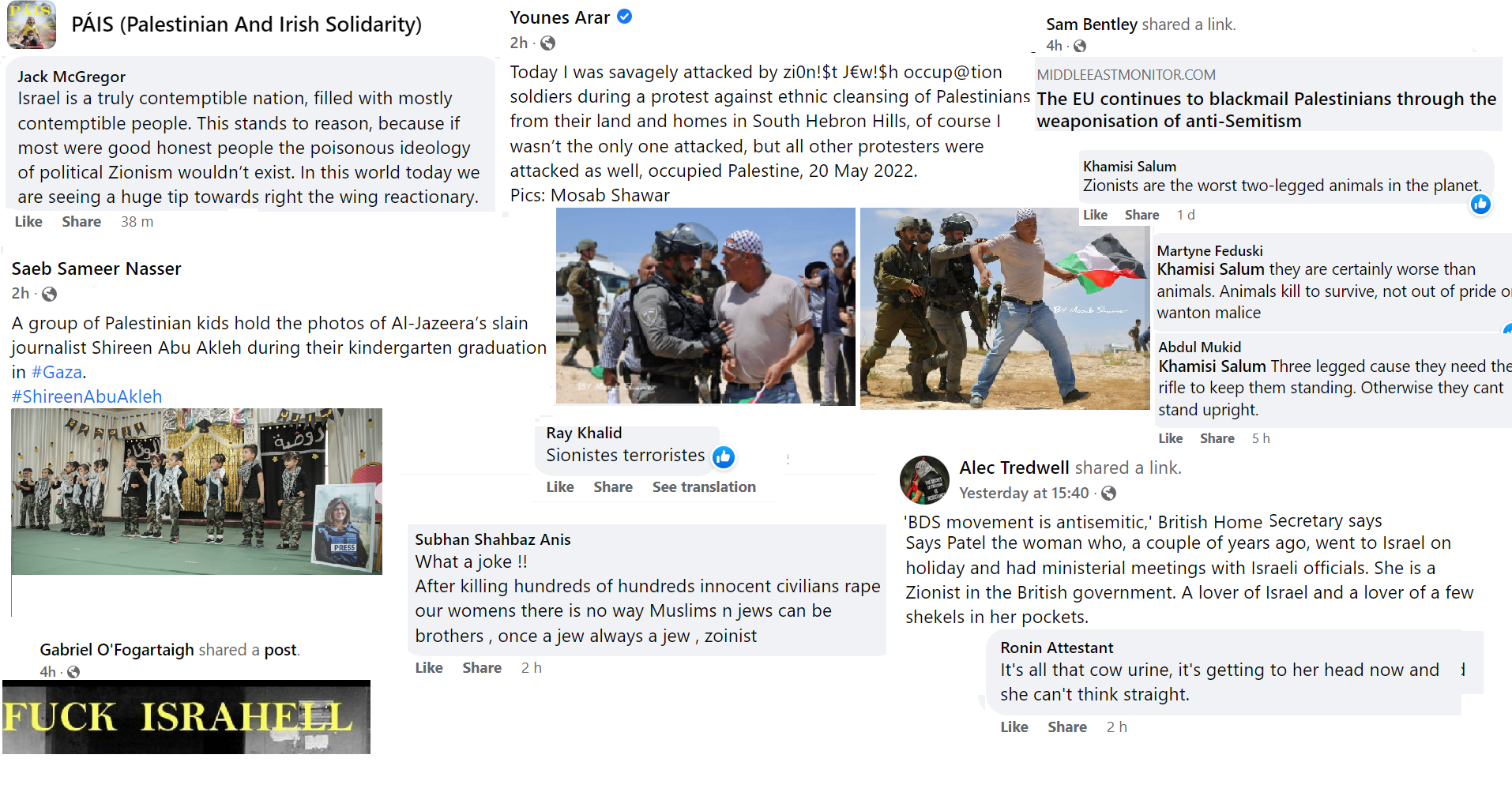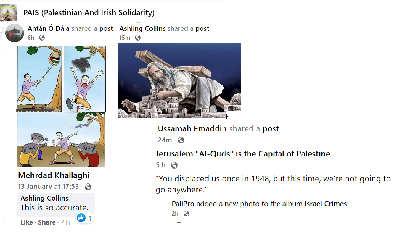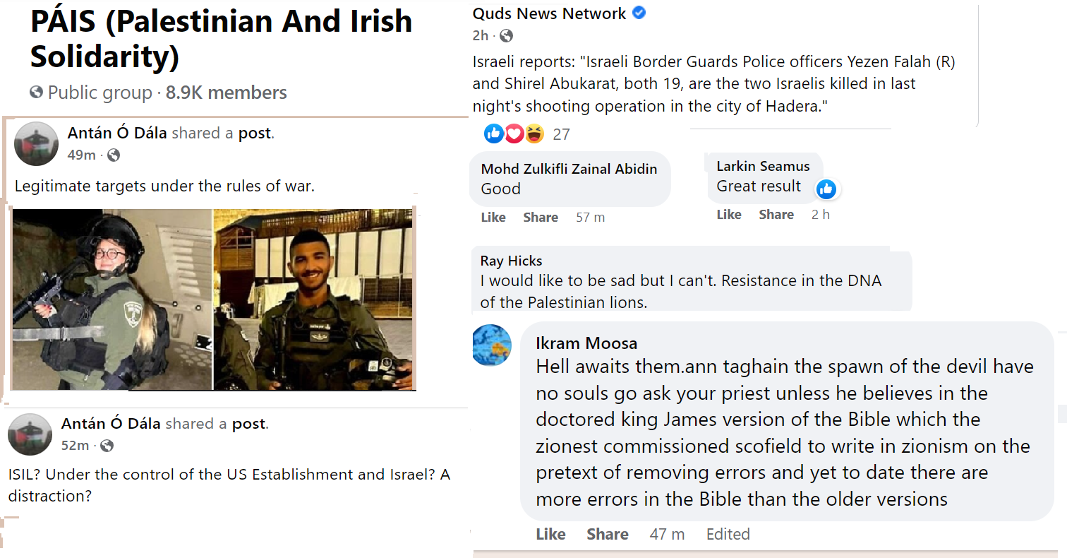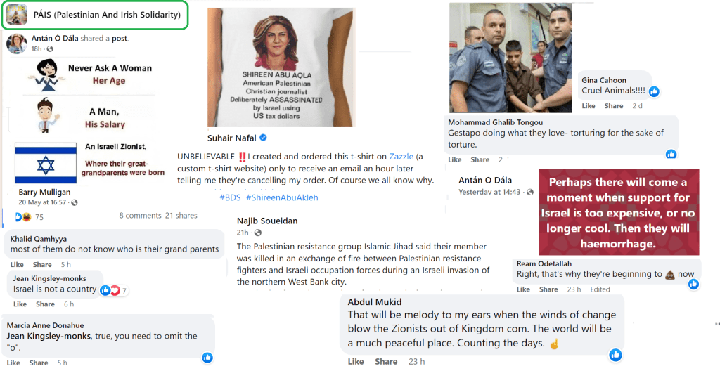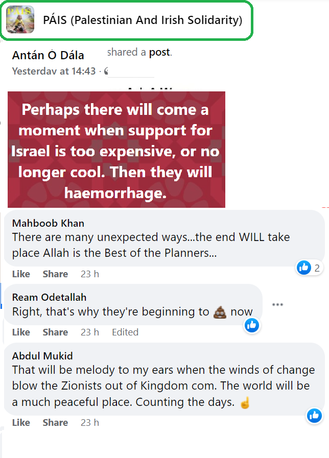 PAIS is a prolific group now numbering nine thousand members but, as with all Facebook groups, their kernel of activists is probably not more than a hundred. Some of these activists post many times a day. They keep a close eye on PressTV, Quds News Network and Viva Palestina for breaking news stories. The mainstream news also offers continual developments, such as the sad death of Shireen Abu-Akleh, whose photo is now the profile picture of many of the group members. The group consensually favours the extermination of Israel and, in all their posts, they present reasons why they consider this desirable. They are not above contemptuous racist humour directed at Jews whom they consider a plague on the earth.