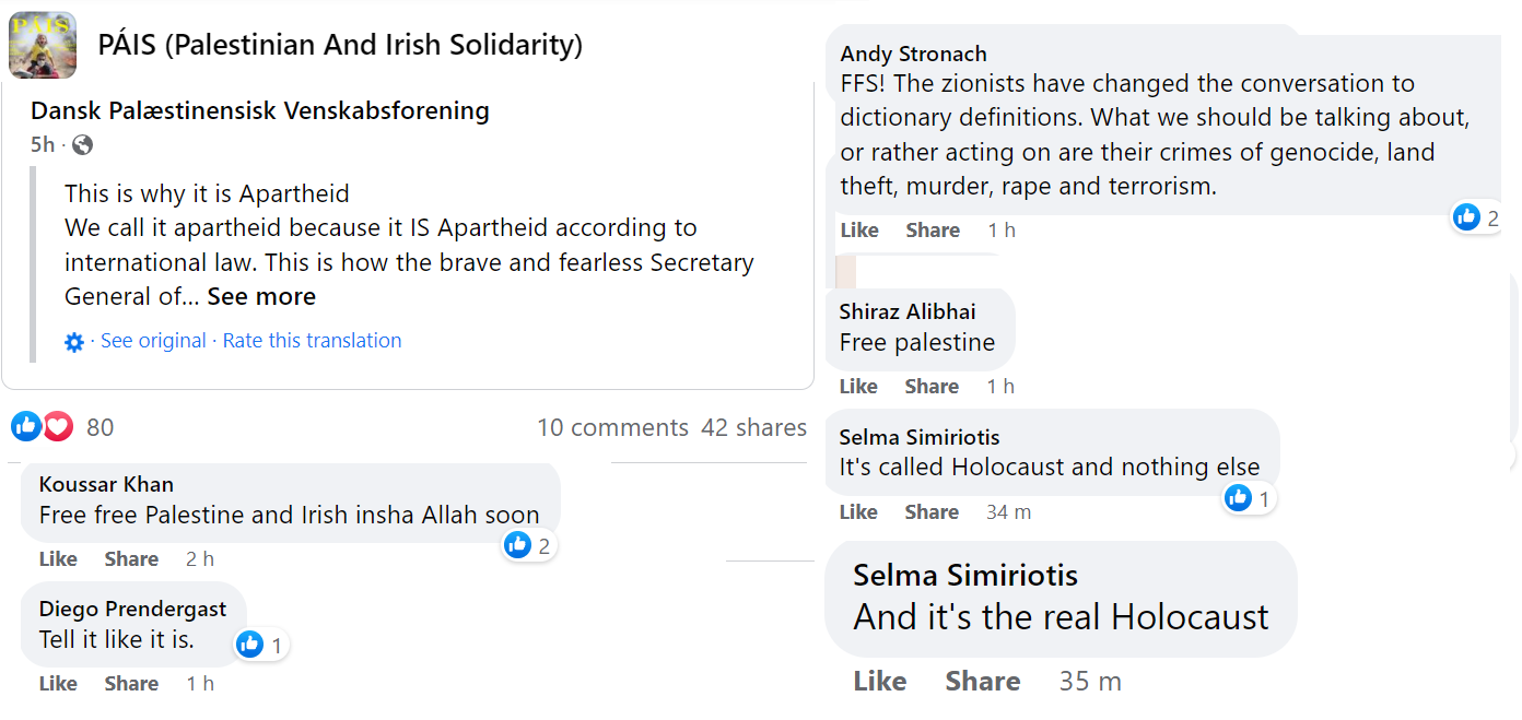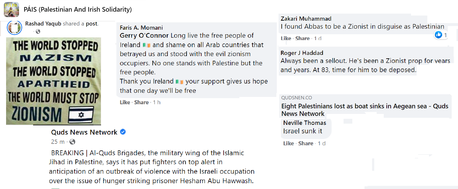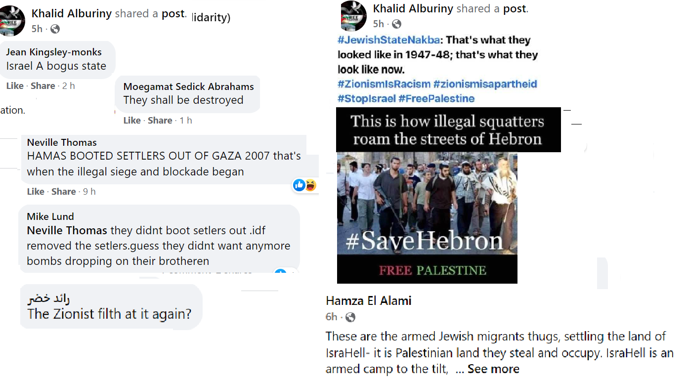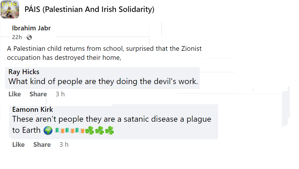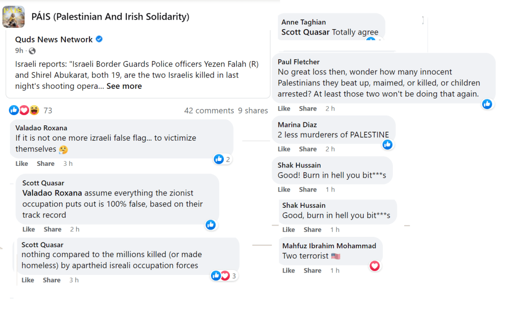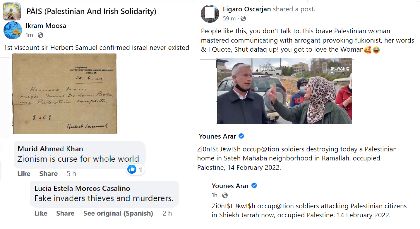 PAIS is a prolific group now numbering nine thousand members but, as with all Facebook groups, their kernel of activists is probably not more than a hundred. Some of these activists post many times a day. They keep a close eye on PressTV, Quds News Network and Viva Palestina for breaking news stories. The mainstream news also offers continual developments, such as the sad death of Shireen Abu-Akleh, whose photo is now the profile picture of many of the group members. The group consensually favours the extermination of Israel and, in all their posts, they present reasons why they consider this desirable. They are not above contemptuous racist humour directed at Jews whom they consider a plague on the earth.