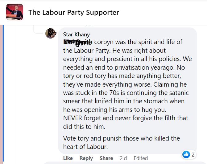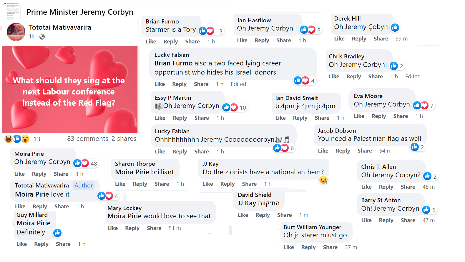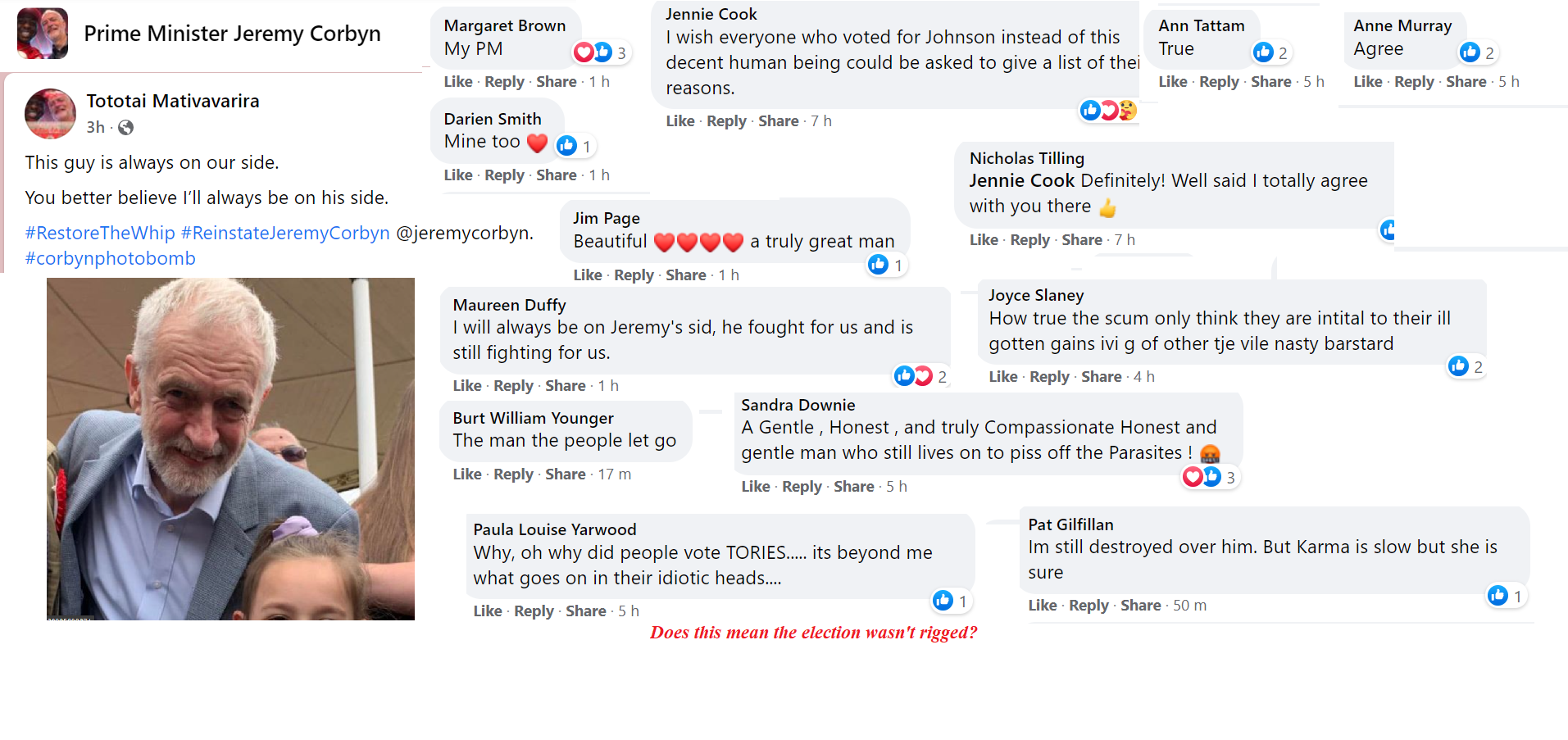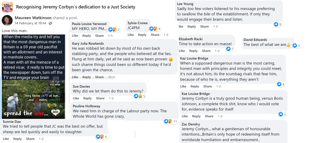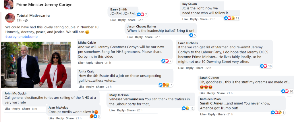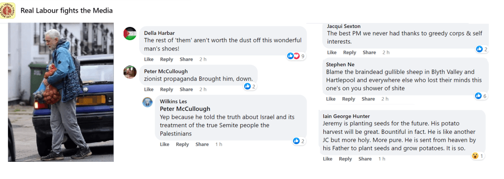 There has been no improvement in this state of affairs in the Corbynist social media I have seen. Whereas the suggestion that ‘the Rothschilds’ won the 2019 General Election seemed initially the opinion of outliers, it is now orthodoxy to say in these groups that Israel decided the election result. It seems ridiculous when you consider that Israel’s proportional representation leads time after time to inconclusive election results. It seems ridiculous for many reasons but it is an assertion which occurs repeatedly in the Corbynist groups on Facebook and is by now an urban legend nearly as popular as the anecdote about the awe of John Wayne. Even Corbyn himself suggested, in an interview he gave to an Al Mayadeen reporter, that Benjamin Netanyahu had played a part in his, Corbyn’s electoral failure.