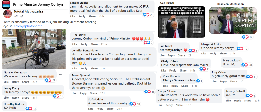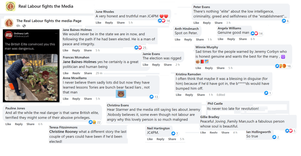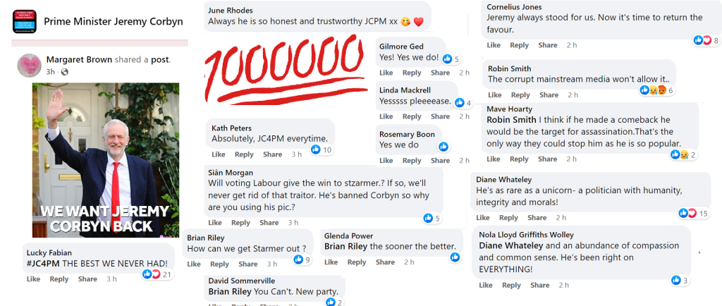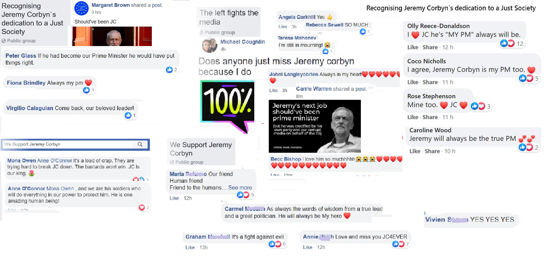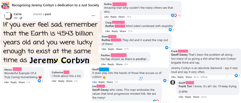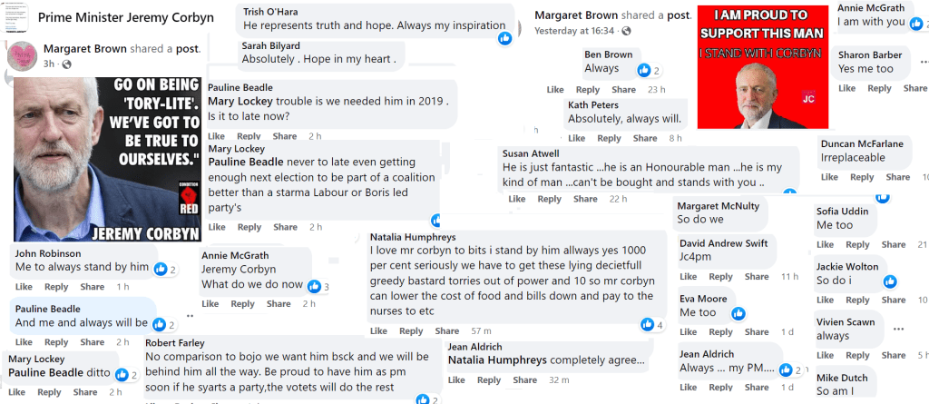 The people making the comments are often the same individuals, members of every Corbynist group they can find and active in all of them. Can we put a number on them? The larger groups have more than 60,000 members and the smaller groups have fewer than 2,000. The usual number is about 10,000 members, a hundred of whom are regular contributors to the group.