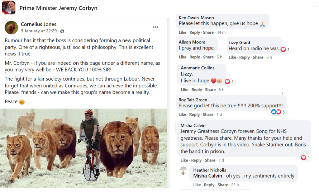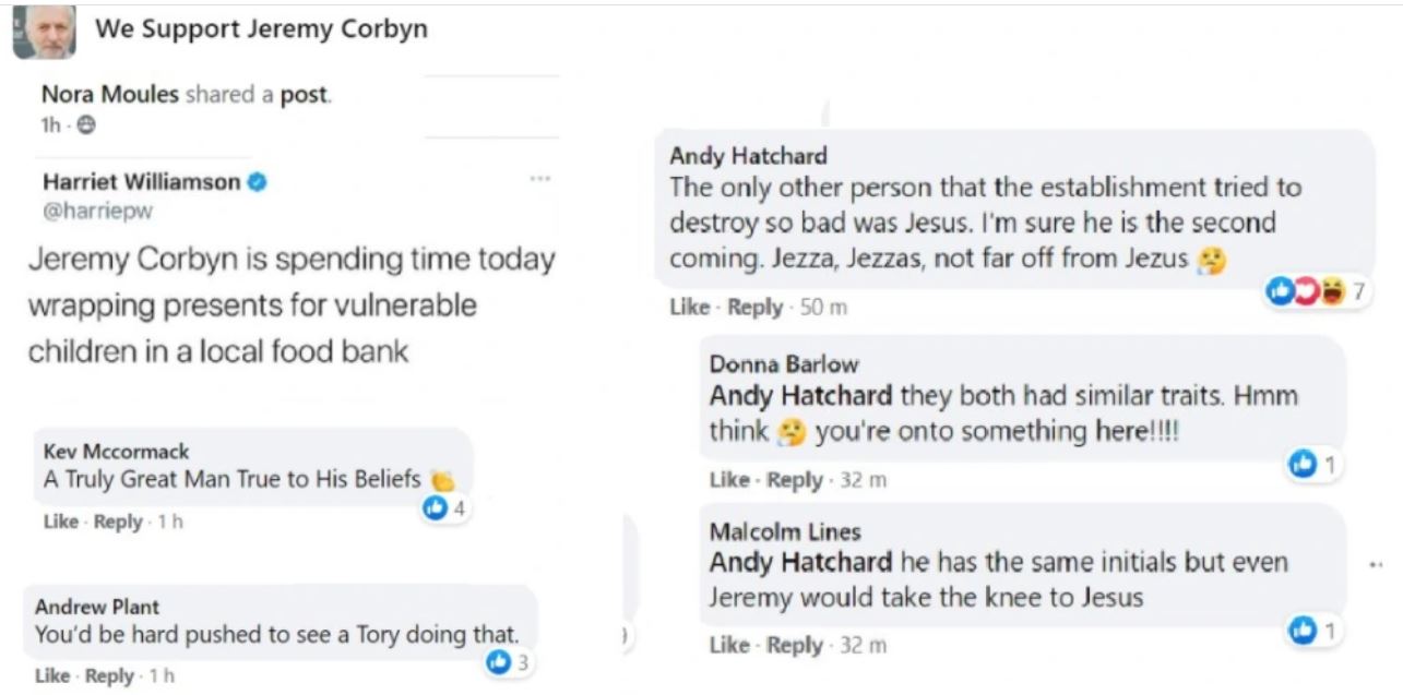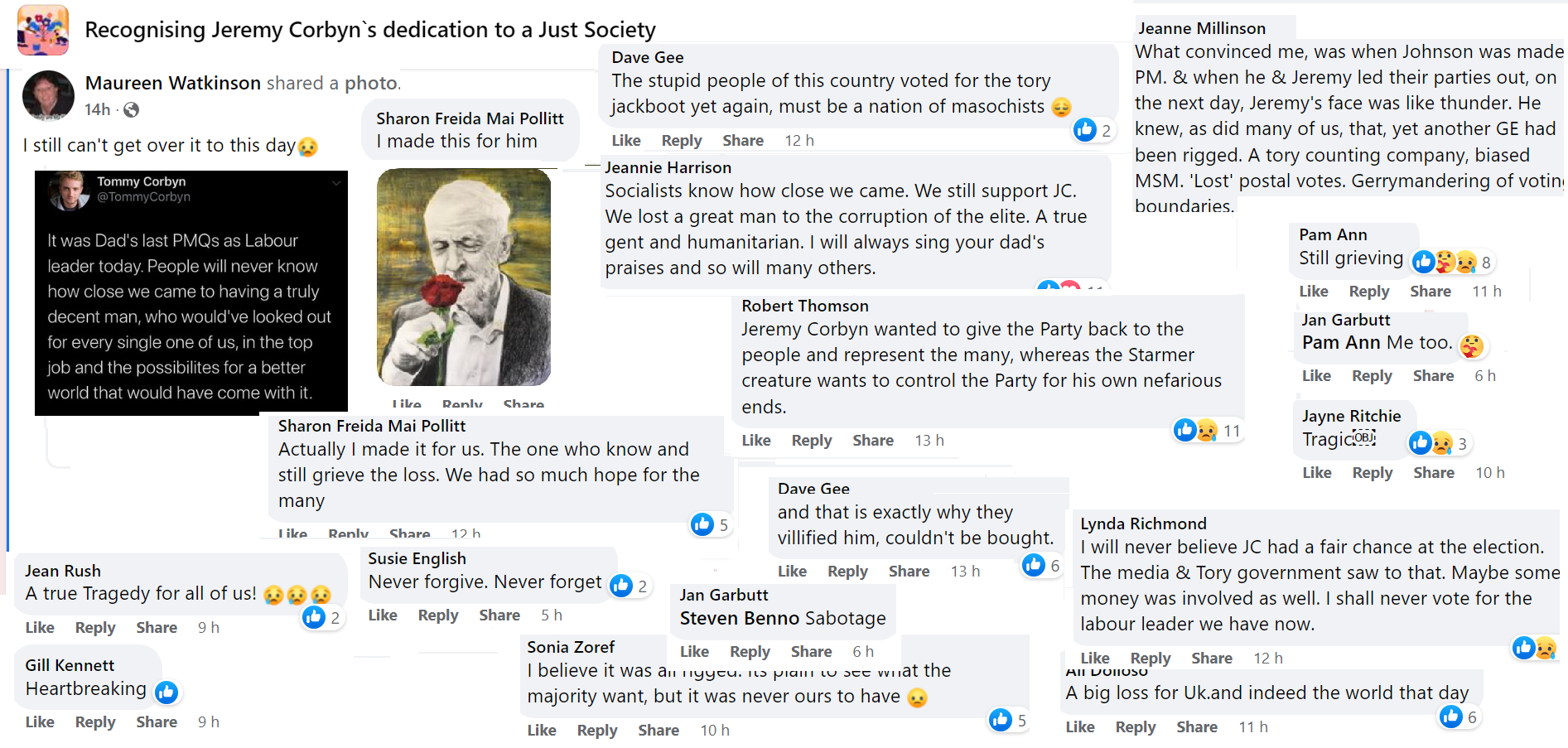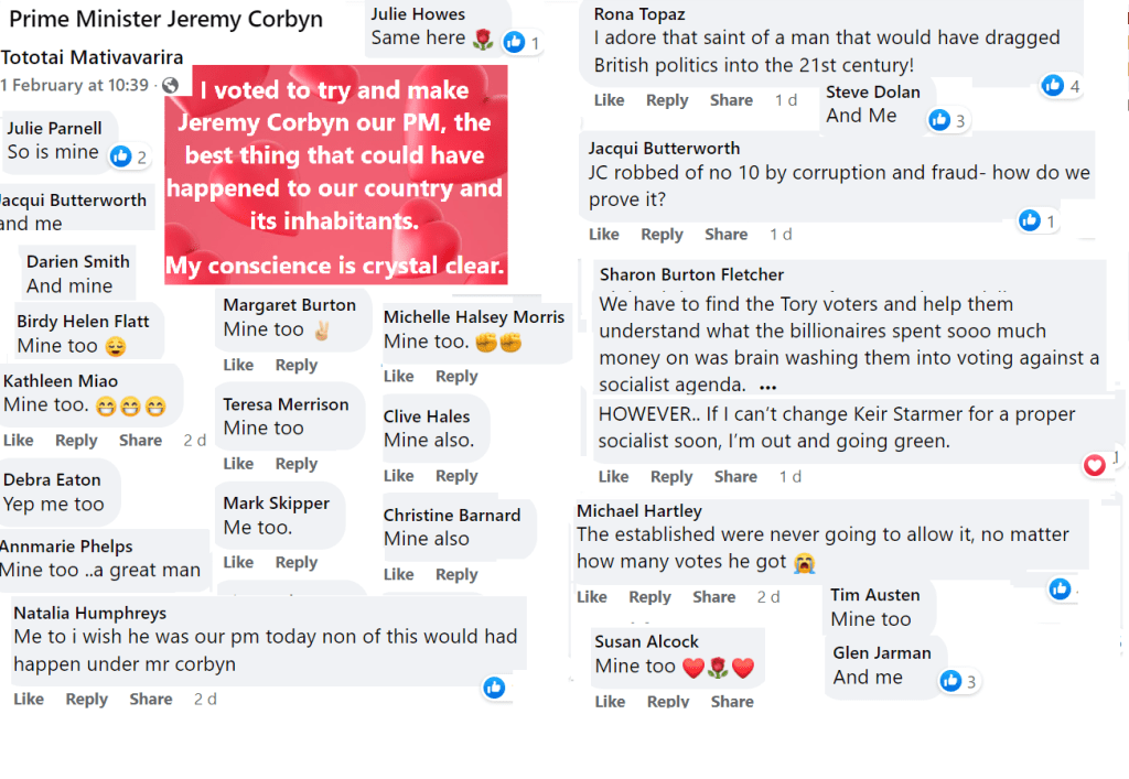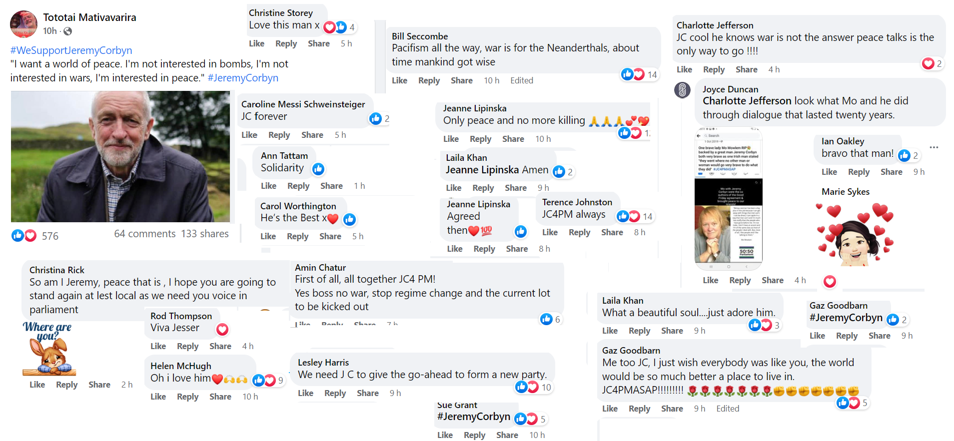 The people making the comments are often the same individuals, members of every Corbynist group they can find and active in all of them. Can we put a number on them? The larger groups have more than 60,000 members and the smaller groups have fewer than 2,000. The usual number is about 10,000 members, a hundred of whom are regular contributors to the group.