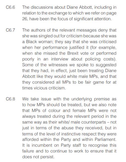 The authors of the derogatory WhatsApp messages about Diane Abbott insisted that their hostility was unrelated to her being a black woman. Paragraph C6:8 of the report sees it this way.