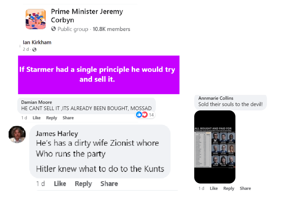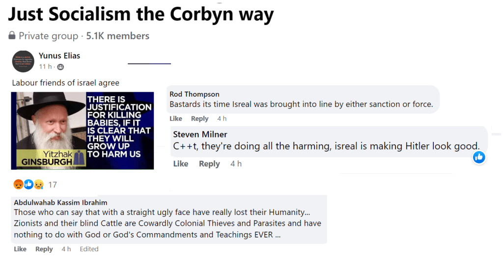 The screen shots below show some of the comments I have seen. My stalking is not so thorough that I see all the Der Stürmer tribute acts of the Corbynist (sometimes also Provisional IRA) forums. Perhaps I should call it neo-neo-nazism [sic] because it is bespoke for the 21st century, for the left and for enemies of Israel. Some of this material is produced by Iranian sources, or Hamas or Hezbollah, some from Pakistan and I see it only because it filters through to groups with British or Irish administrators.