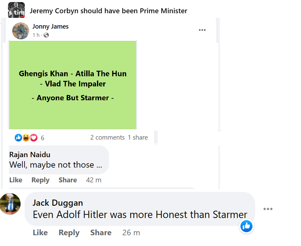 I posted a screen shot on Twitter last night, showing a bit of Hitler fandom in a private (you have to join to see the content) Facebook group called ‘Just Socialism the Corbyn Way’. On Twitter, there were many horrified reactions to the screen shot – although not at all in the Facebook group – and, so far, no one has attempted to excuse it. I did wonder how one might make a case for excusing it, and thought the strongest argument would be that all groups, however well-meaning, tend to include the odd disgusting comment, posted by supporters with poor judgment.
