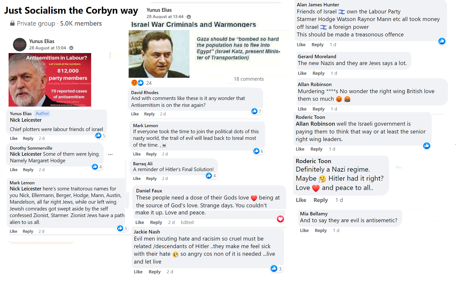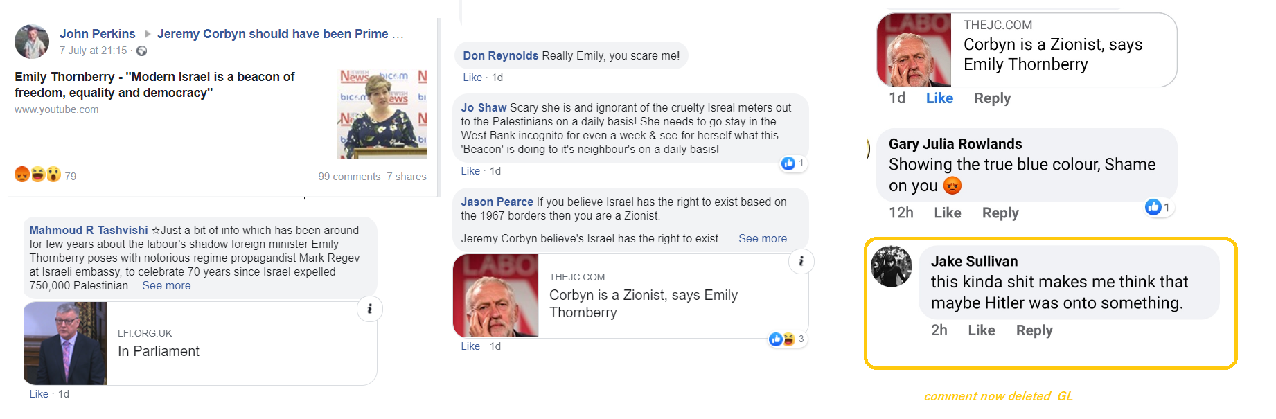 The screen shots below show some of the comments I have seen. My stalking is not so thorough that I see all the Der Stürmer tribute acts of the Corbynist (sometimes also Provisional IRA) forums. Perhaps I should call it neo-neo-nazism [sic] because it is bespoke for the 21st century, for the left and for enemies of Israel. Some of this material is produced by Iranian sources, or Hamas or Hezbollah, some from Pakistan and I see it only because it filters through to groups with British or Irish administrators.