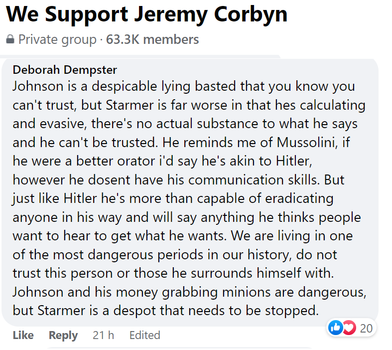 I posted a screen shot on Twitter last night, showing a bit of Hitler fandom in a private (you have to join to see the content) Facebook group called ‘Just Socialism the Corbyn Way’. On Twitter, there were many horrified reactions to the screen shot – although not at all in the Facebook group – and, so far, no one has attempted to excuse it. I did wonder how one might make a case for excusing it, and thought the strongest argument would be that all groups, however well-meaning, tend to include the odd disgusting comment, posted by supporters with poor judgment.
