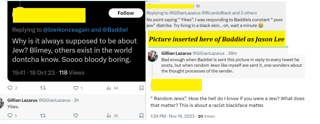 In further dialogue, the interlocutor tells me that he is black, so I consider it reasonable that he is appalled by blackface performance and cosplay. He objects to it from David Baddiel as he sees him as a person who makes moral pronouncements against antisemitism and, perhaps to show his workings out, he sends me a picture of marchers carrying a banner displaying the words ‘International Jewish Anti Zionist Network.’